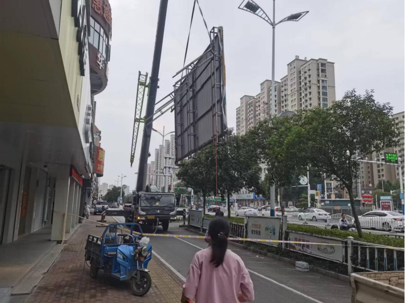 拆除高危广告。针对逾期未整改的高危安全隐患户外广告,8月14日,县城市管理局立即组织力量进行整体拆除。前期发现浍河路中段老工会三楼楼顶的高空户外广告牌,高约2米,长约30米,广告牌的支架经过风吹日晒,锈迹斑斑,焊点出现松动,且喷绘广告布已经风化褪色,破损不堪,随时可能脱落,存在重大的安全隐患。由于此户外广告牌位置高,面积大,且材质为钢结构质量重,综合考虑到闹市区行人安全、避免拥堵等多方面因素,拆除现场,明确责任分工,执法队员现场拉起警戒线,负责维持秩序;施工人员负责拆除,出动大型吊机1台、气焊机2台、专业拆除人员5人,进行分段切割。历时6小时,圆满拆除高空广告60余平方米,及时消除高空安全隐患,保障了周边群众出行安全。