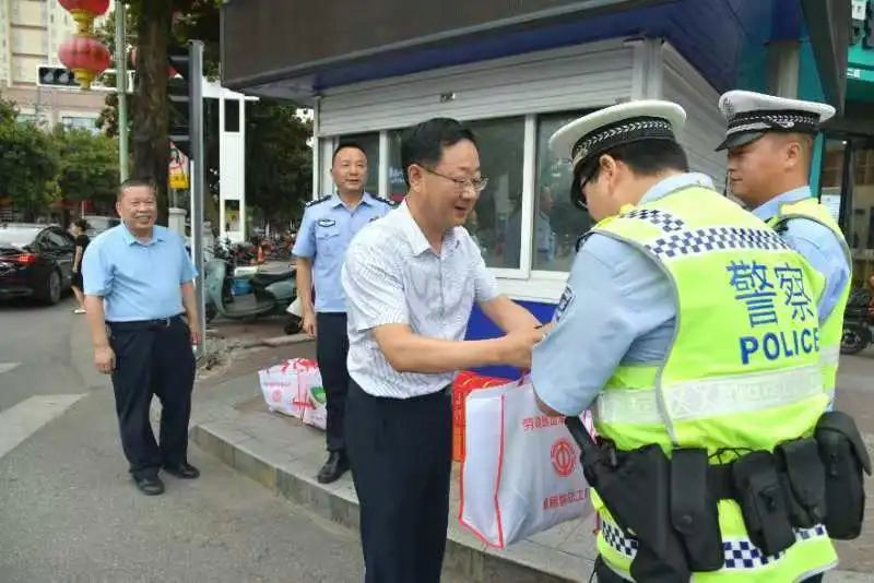 8月16日,市人大常委会副主任、县委书记胡新利为高温下坚守岗位的一线工作者送去防暑降温物品,向他们表达亲切的慰问和衷心的感谢。县政府副县长刘小华,三合园区党工委书记、管委会主任陈晓斌参加活动。