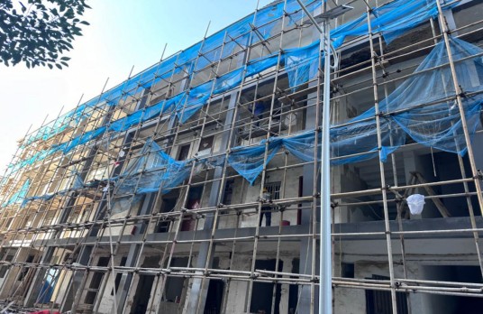 根据居民意愿,制定危旧房改造棉纺小区1号楼改造方案,主要内容包含增设小型厨房、维修公共走廊、加固支撑桩梁、铺设屋顶防水、改造雨水排管、开展立面整治等,改造方案经过全体居民、议事会、业委会、社区、街道、市直部门等多方共商共议。