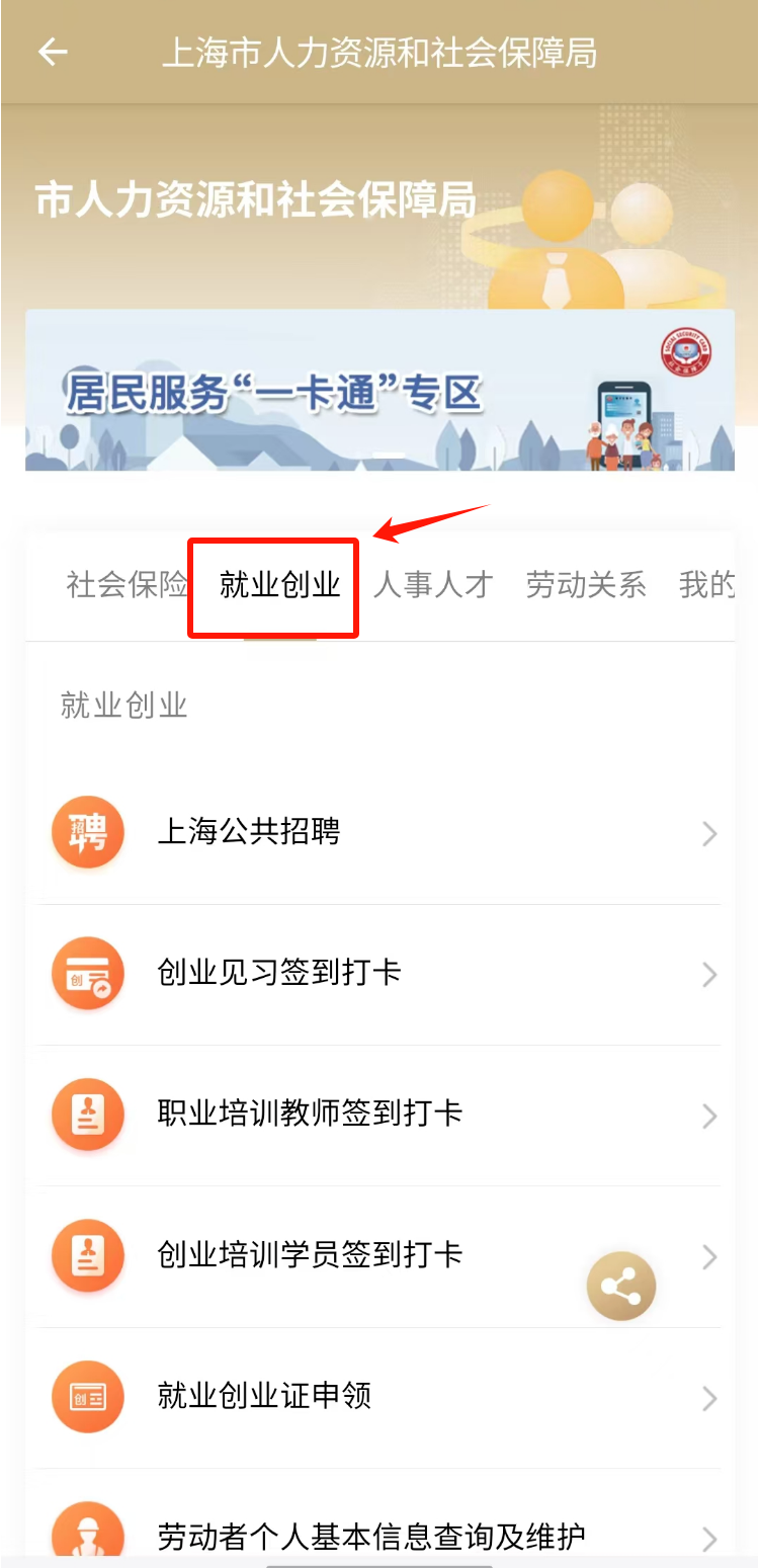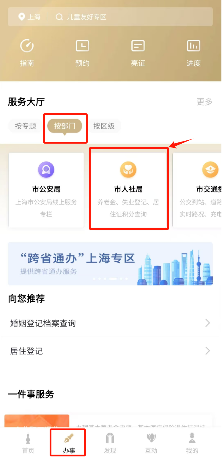 第一步:本市户籍流动人员打开“随申办市民云”APP,选择下方“办事”菜单栏,按部门选择“市人社局”。