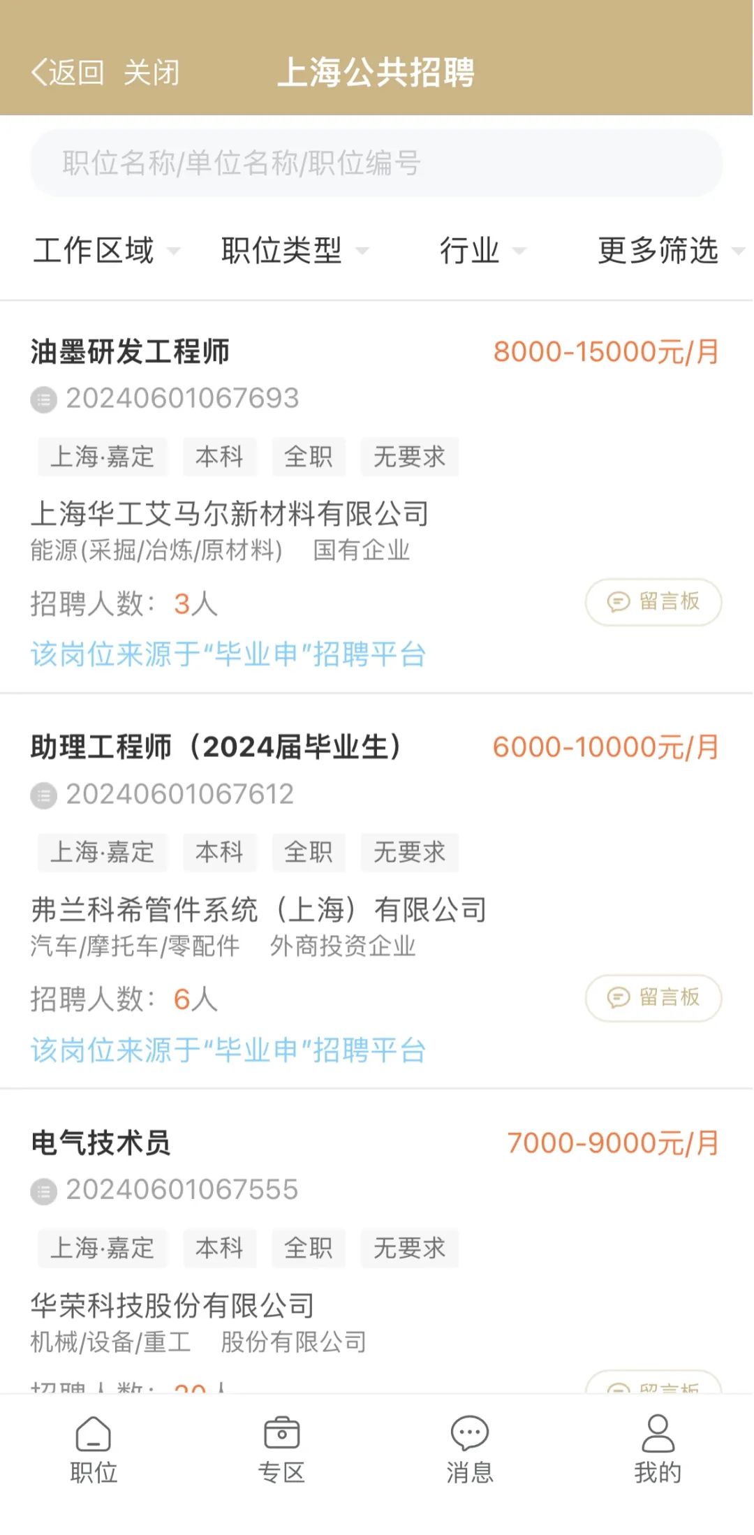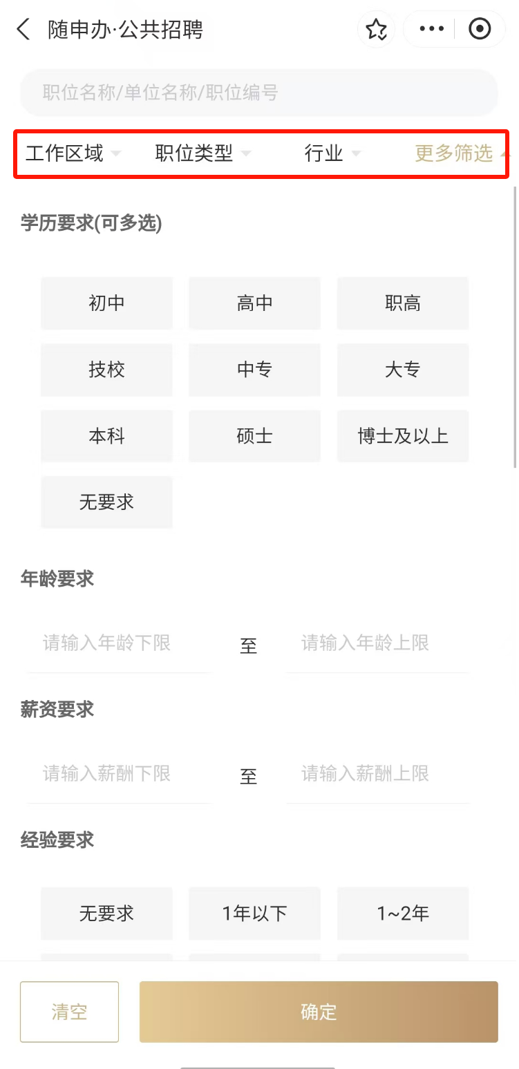 3.选择“职位”菜单栏,一键查看最新和智能推荐岗位。点击右上角“筛选”按钮,可按照“工作区域”、“职业类型”、“行业”等标签进行职位筛选。