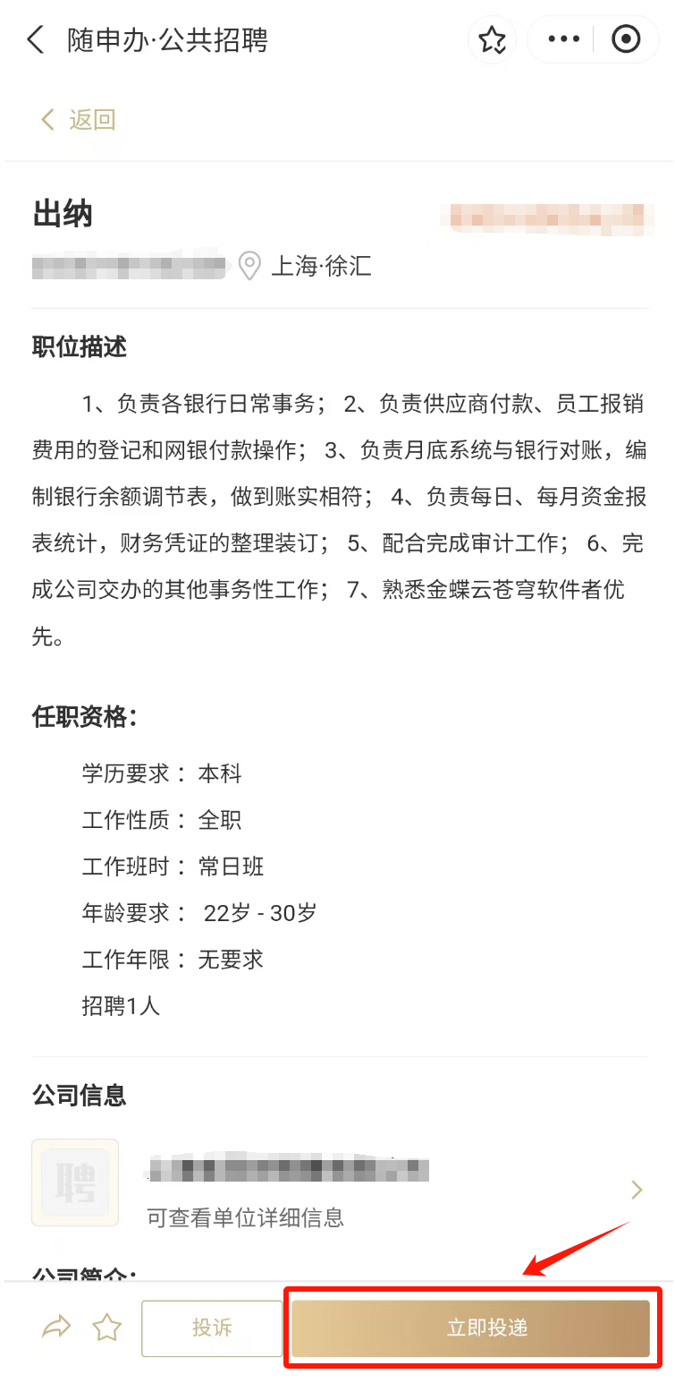 4.点击感兴趣的职位,可在线查看岗位详细信息,点击信息页面下方点击“立即投递”,即可投递简历,还可通过“转发”按钮一键分享职位信息。