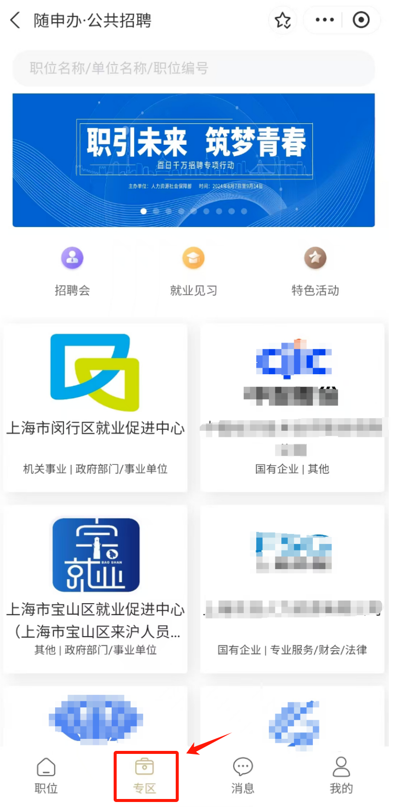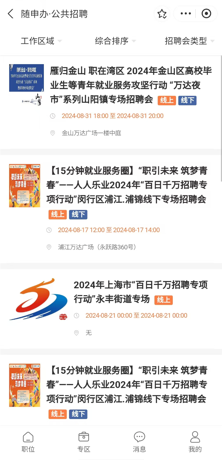 5.点击“专区”菜单栏,即可在线查询招聘会信息,解锁更多就业机会~