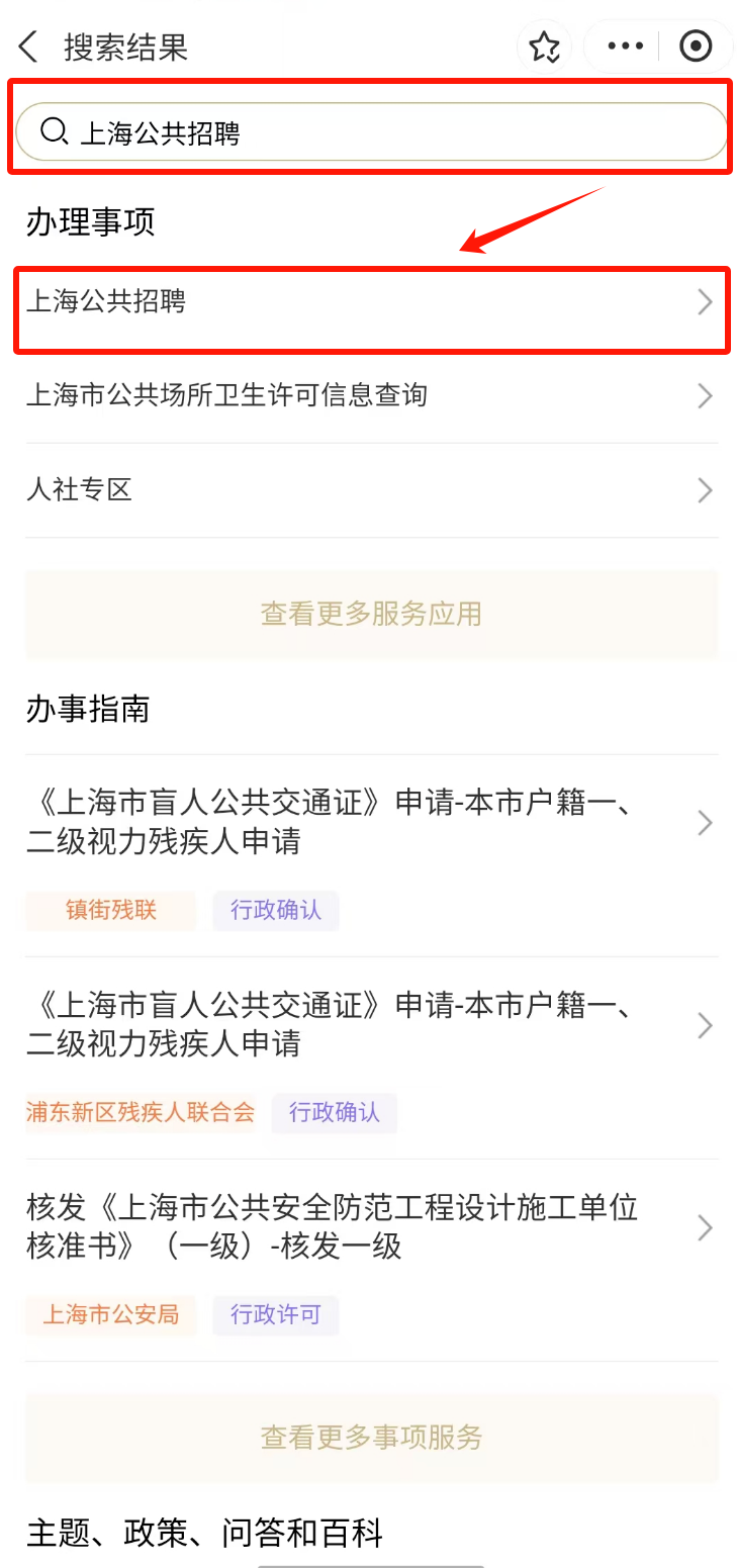 1.打开“随申办市民云”(支付宝小程序、APP、微信小程序),首页搜索“上海公共招聘”服务。
