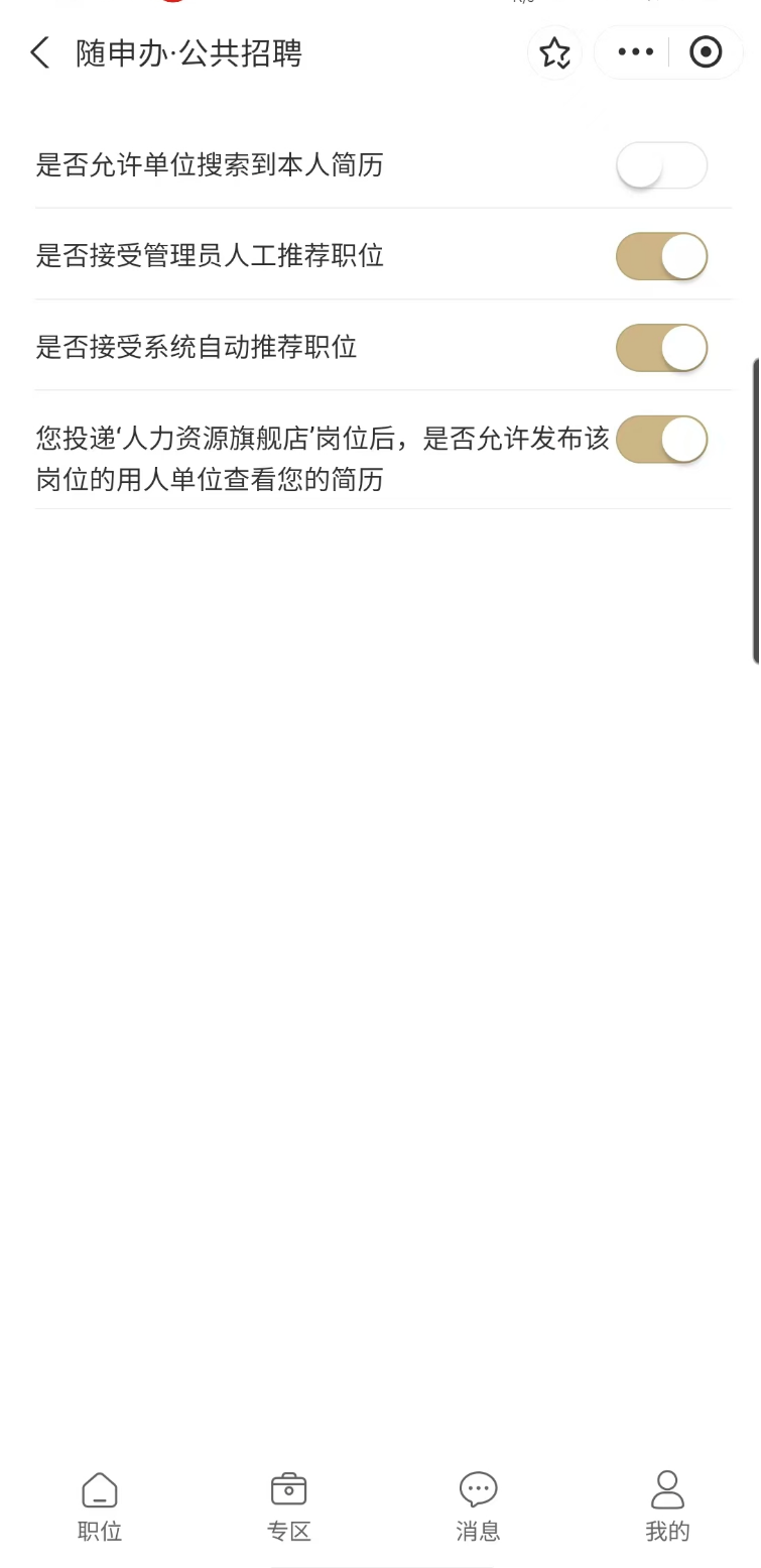 2.完善个人基本信息后,选择“我的”-“我的简历”填写个人简历,记得在“权限设置”里开启“接受系统自动推荐职位”,可以获取更多职位信息哦~