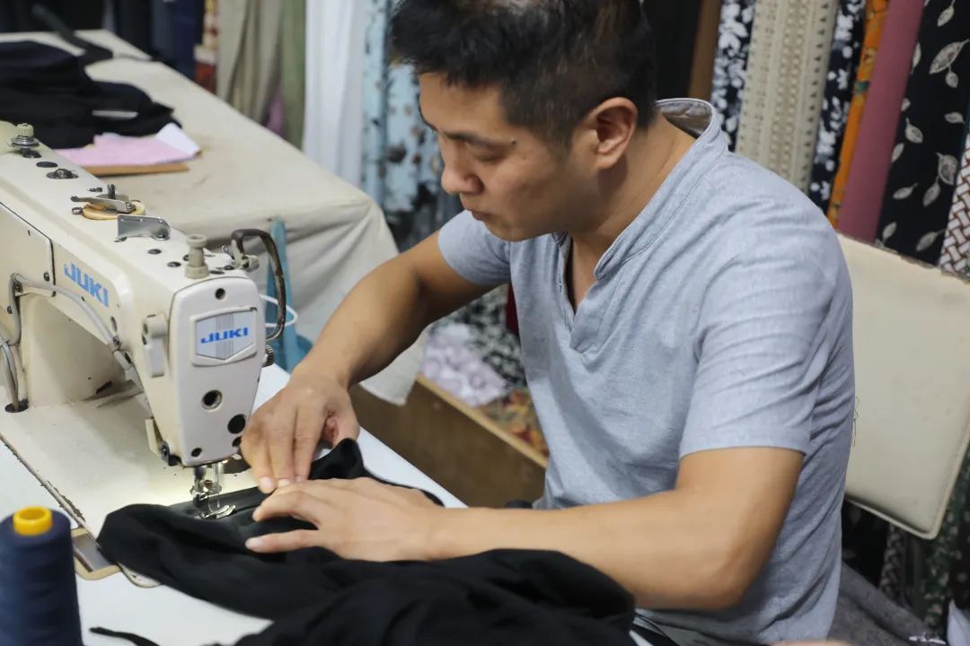 店铺的一面墙上挂满了曹祥波设计并剪裁的新式连衣裙、改良旗袍和各色衬衫。“这些样式都是时兴的,像这个吊带连衣裙、香云纱的裙子,还有这件棉麻料的新款女士上衣……只要顾客有需要,就算是没有做过的款式,我也会去尝试。”曹祥波津津乐道地介绍起自己的作品。