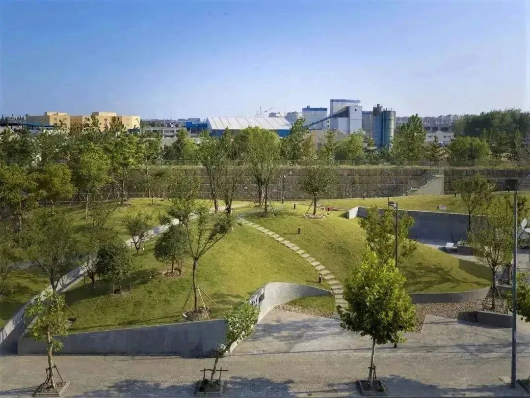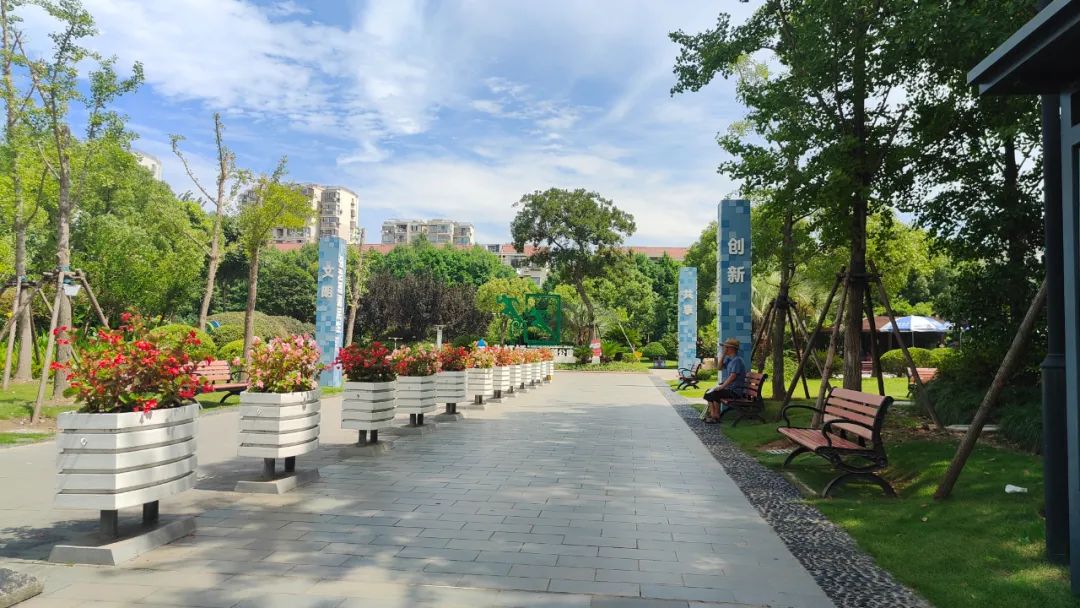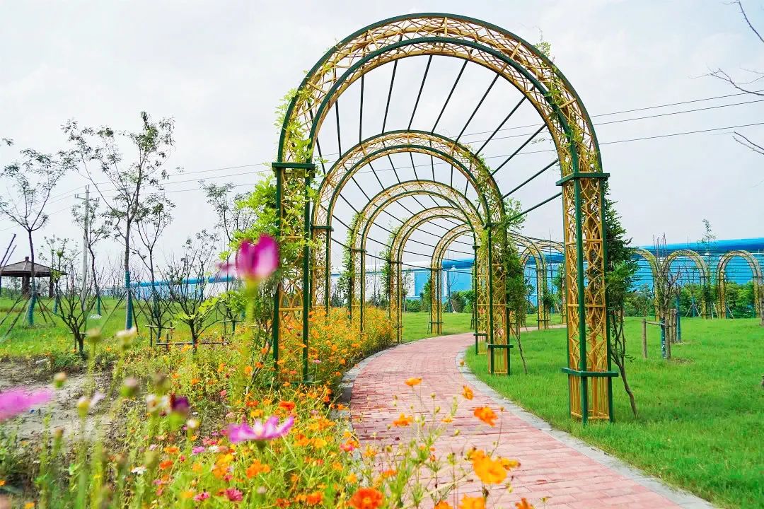 目之所及有绿地、步道、花架、凉亭