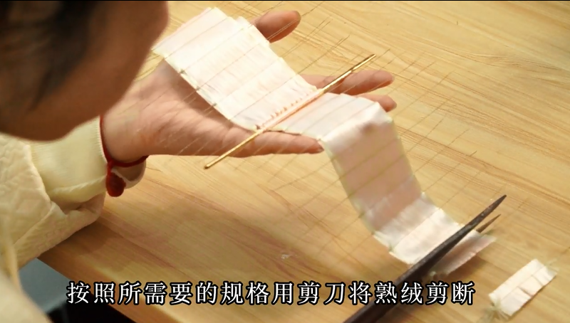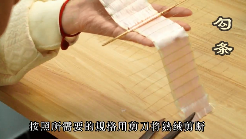 4.勾条:按照所需要的规格用剪刀将熟绒剪断。
