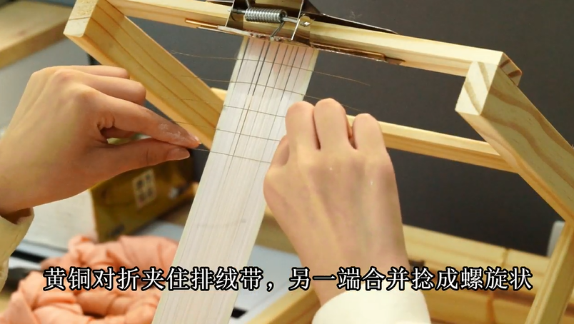 3.上铜丝:黄铜对折夹住排绒带,另一端合并捻成螺旋状。