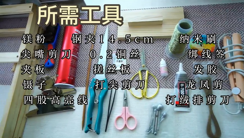 工具材料:镁粉、钢夹14.5厘米、纳米刷、尖嘴剪刀、0.2铜丝、绑线签、夹板、搓丝板、发胶、镊子、打尖剪刀、龙凤剪、四股高亮线、打绒排剪刀