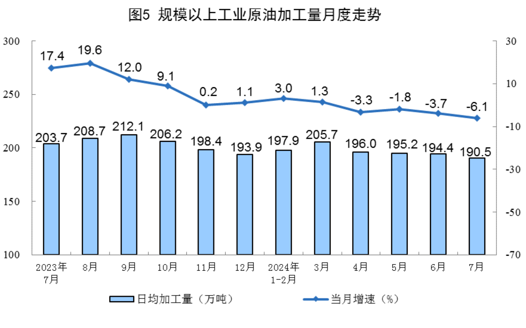 原油加工有所下降。7月份,规上工业原油加工量5906万吨,同比下降6.1%,降幅比6月份扩大2.4个百分点;日均加工190.5万吨。1—7月份,规上工业原油加工量41915万吨,同比下降1.2%。