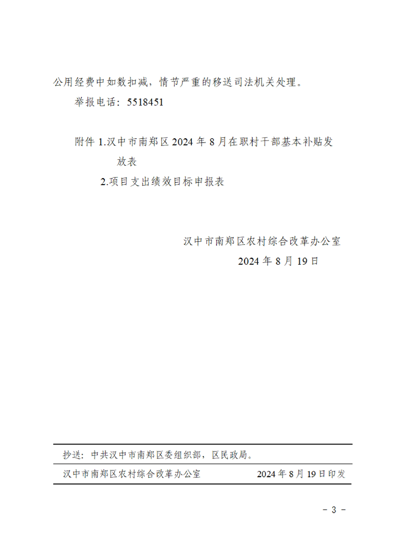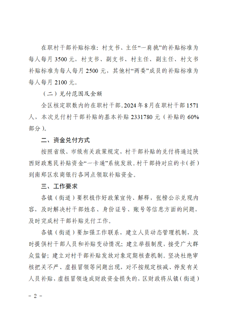 汉中市南郑区农村综合改革办公室关于兑付2024年8月份在职村干部基本补贴的通知