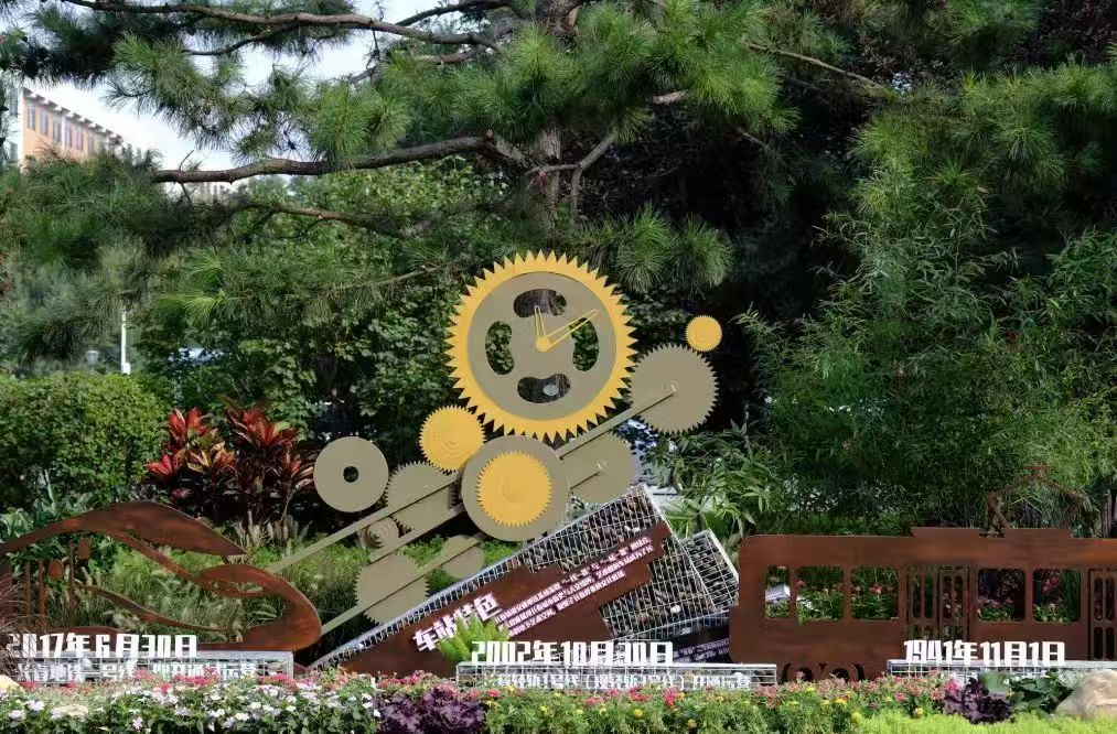 面对机遇与挑战,朝阳园林敢于展开良性竞争,通过参赛不断成长。参赛代表队团结协作,经过多日精心设计筹划建设,收获一个寓意深刻的景观作品。作品以发扬“劳动精神、工匠精神、创新精神”为主旨,以“时光轨迹”为设计着力点,充分融入园林专业技能积淀,利用绿化植材运用、轨道交通发展与文化地标等关键要素为造景核心驱动。场景构建深入挖掘历史文化与人文情怀的特色元素,最大程度展现城市园林建设与智慧城轨交织碰撞下,创新赋能为时代发展带来巨大助力。景观是理念的载体,是技艺的呈现,整个景观由乔木、灌木、花卉及雕塑模型融合打造,将设计意图投射在不同点位,每一处点位都承载着丰富信息,表达新时代绿色生态的不同定义,也成为洞悉园林文化又一窗口。