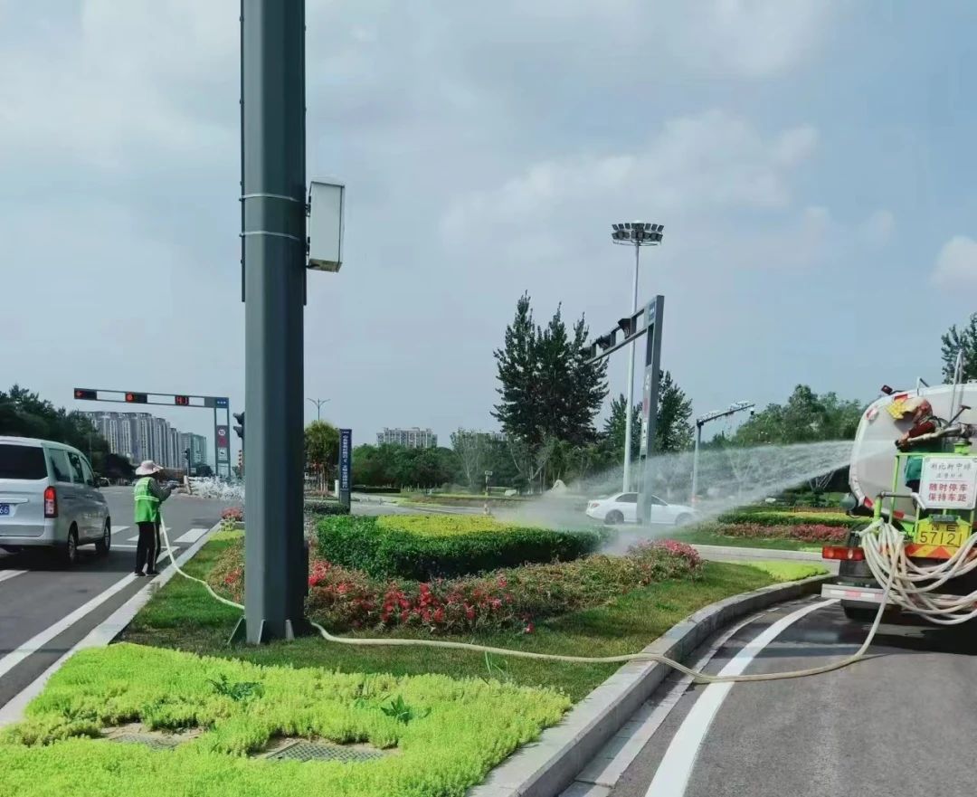 高温时段,合理安排灌溉时间,利用早晚低温减少植物水分蒸发和植株热害,并增加灌溉频次,运用洒水车机械作业、喷灌、人工浇水相结合,确保苗木的正常生长。
