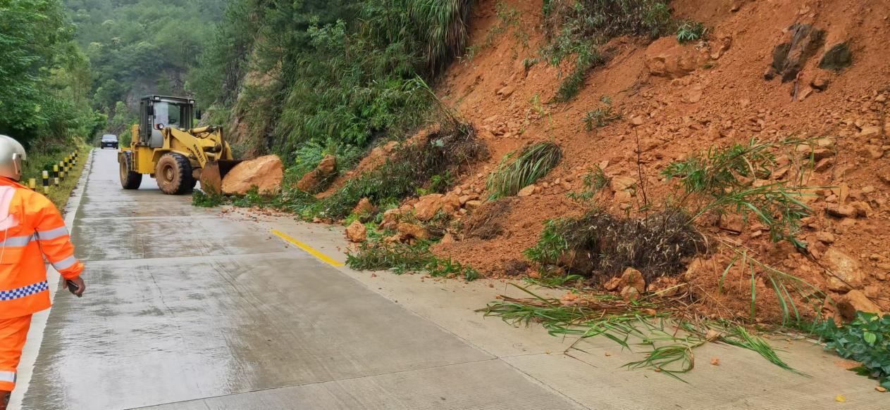 8月20日,省道S277线(K50+800)处,山体在暴雨冲刷过后出现滑坡,岩石滚落路面,阻断交通,养护人员冒雨赶到现场,及时调集机械设备快速清理土石方,全力消除安全隐患,一抹抹雨中的橘黄色守护在公路第一线,为群众的安全出行保驾护航。