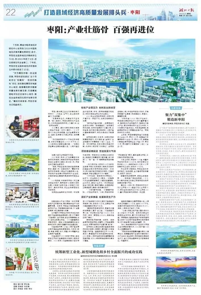 8月23日,湖北日报专版刊发文章《枣阳:产业壮筋骨,百强再进位》,聚焦枣阳产业发展。7月底,赛迪方略县域经济研究中心发布的《2024中国县域经济高质量发展研究》显示,枣阳在全国县域经济最新排名74位,较2023年进了6位,进位速度位列全省第二。7年间,枣阳市在全国县域经济百强排名中累计前进了25位。枣阳将牢牢把握高质量发展这个首要任务,把调整自身产业结构与建设现代化产业体系结合起来,积极培育发展新质生产力,奋力实现全国县域经济百强再进位。