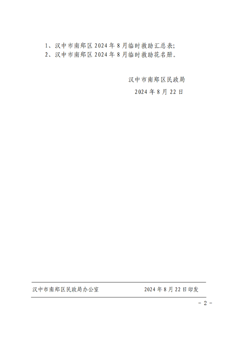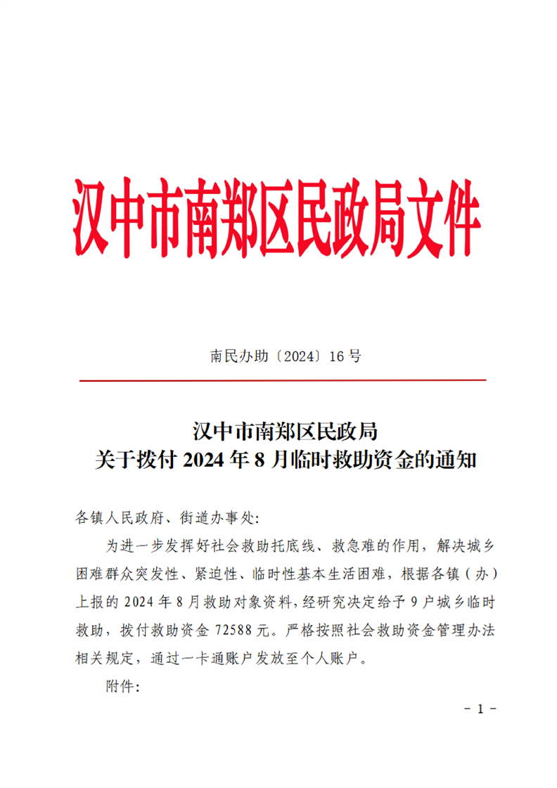 汉中市南郑区民政局关于拨付2024年8月临时救助资金的通知