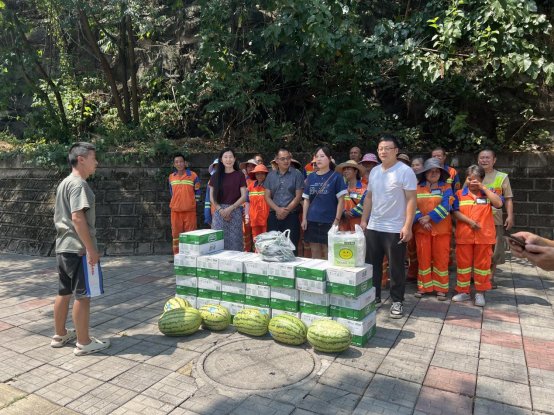 当天上午,区委农业农村工委农技义工队为现场的环卫工人们分发西瓜、矿泉水、藿香正气水等清凉物资,感谢他们为整洁的城市环境付出的辛勤劳动,并叮嘱他们多喝水、注意防暑降温、注意保护好身体。