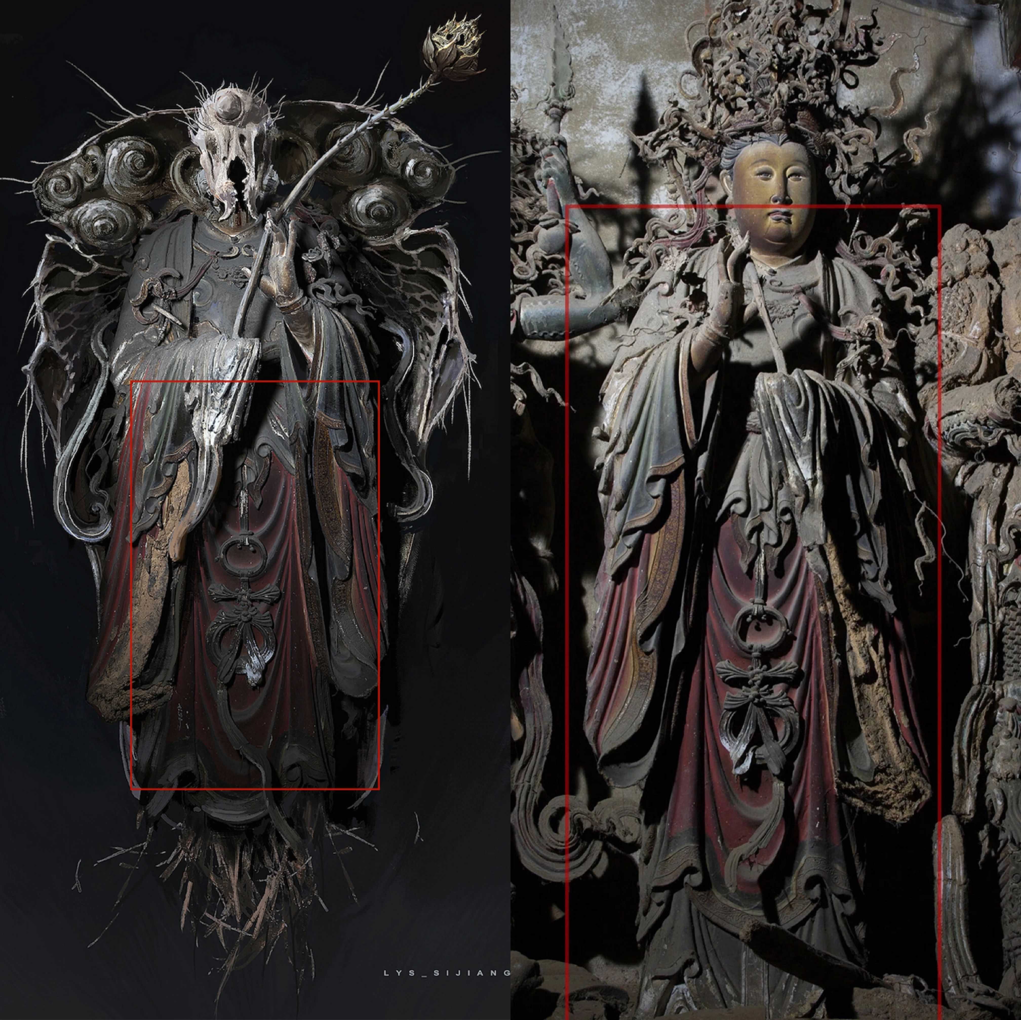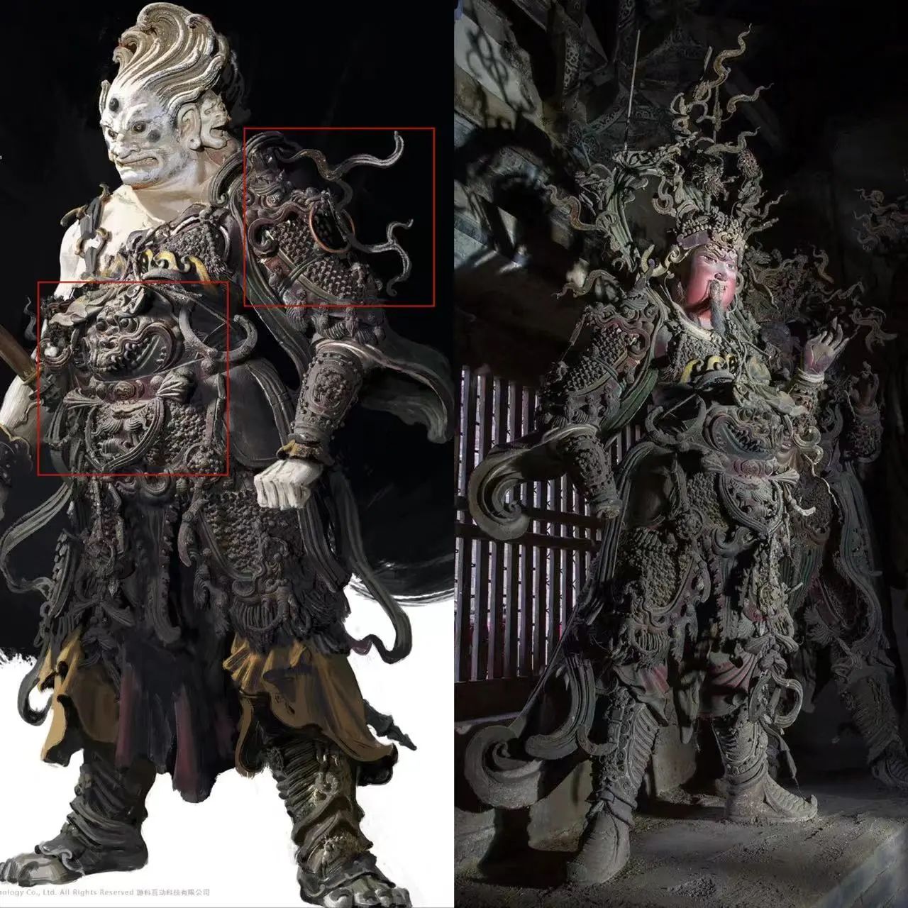 游戏里某场景左侧雕像(左),铁佛寺帝释天(右)
