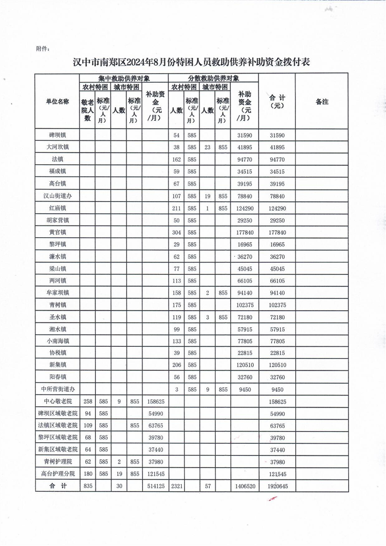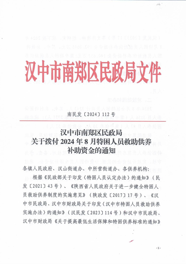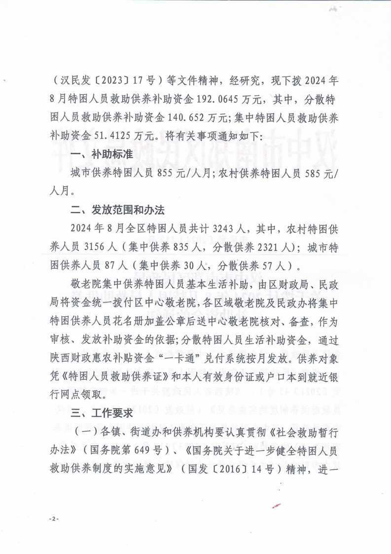 关于拨付2024年8月特困人员救助供养补助资金的通知