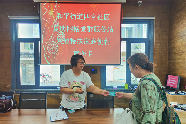 8月23日,和平街道四合社区在昆明网格党群服务站为四合社区特扶人员发放家庭便利就医卡,为他们的生活带去希望与慰藉。