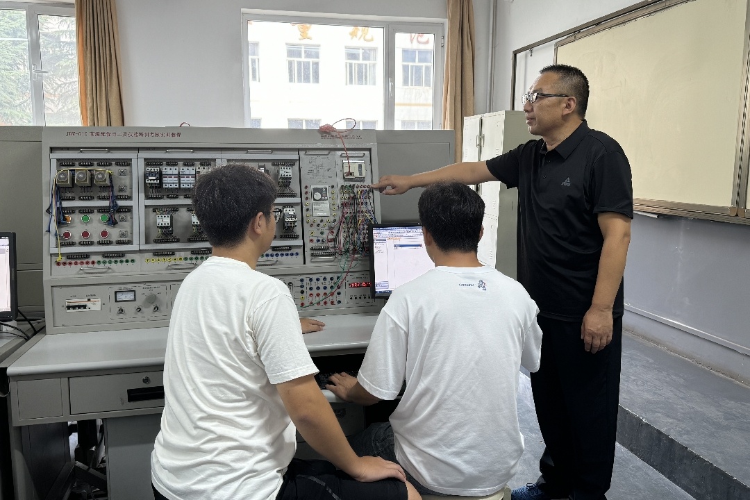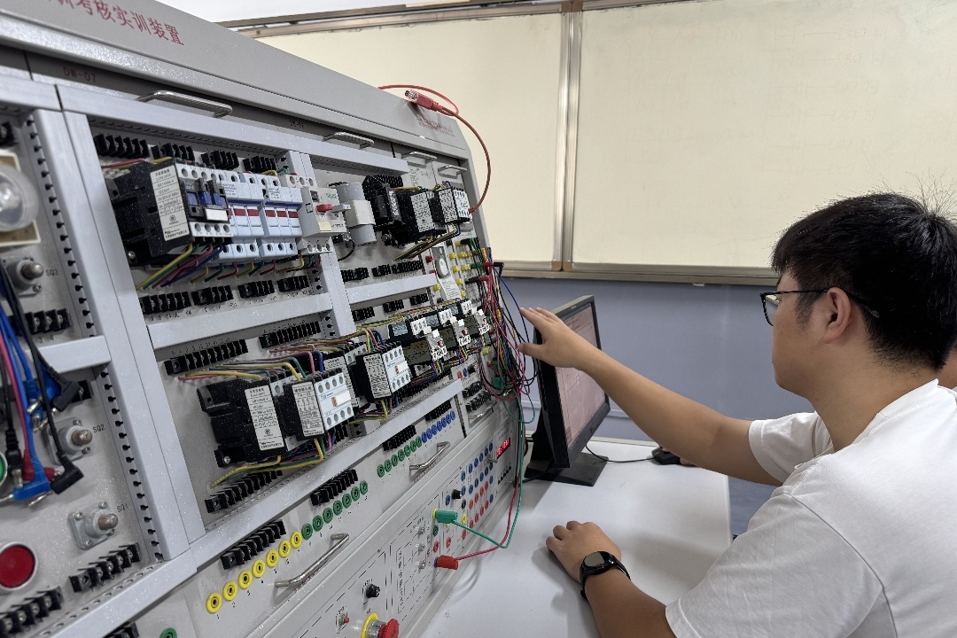 在机电操作实训室,王昊威正和同事一起在老师的指导下进行PLC编程的实际操作。这次专题培训不仅设置了《党的二十届三中全会精神及习近平总书记关于产业工人队伍建设改革的重要论述》《机电岗位从业理念》等理论性课程,还安排了大量实操实训课,能够第一时间将书本上的知识转化到实际的操作中,这让还是“行业新手”的他,对“电工”两个字有了全方位的认识。