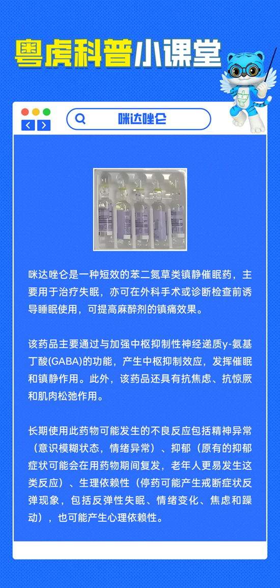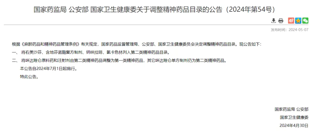 今年5月7日,国家药监局、公安部、国家卫生健康委发布关于调整精神药品目录的公告,将右美沙芬、含地芬诺酯复方制剂、纳呋拉啡、氯卡色林列入第二类精神药品目录;将咪达唑仑原料药和注射剂由第二类精神药品调整为第一类精神药品,其它咪达唑仑单方制剂仍为第二类精神药品。7月1日起正式实施。