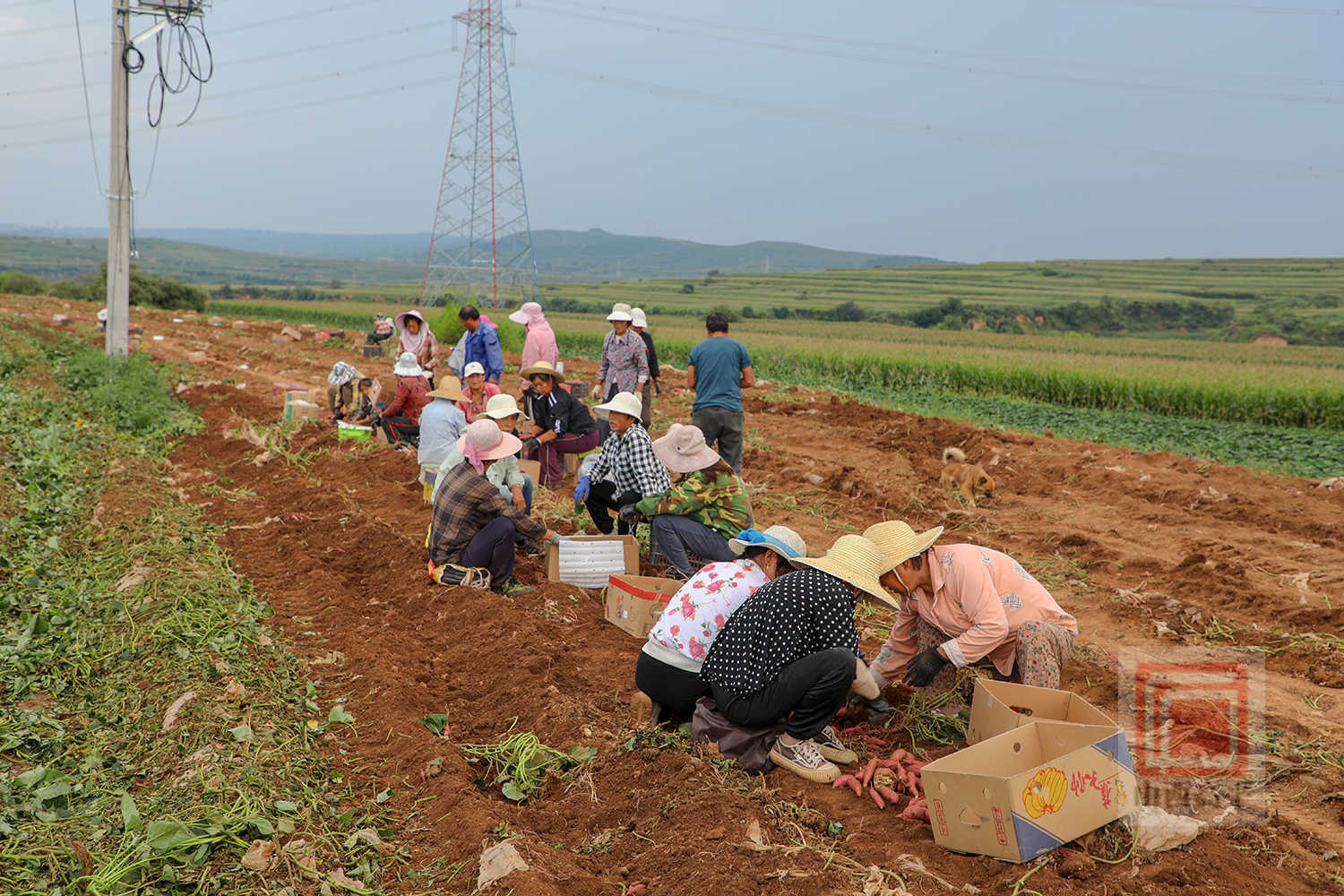 来到红薯种植基地,只见收薯一体机在田间来回穿梭,伴着机器的轰鸣声,一个个大小匀称、色泽红润的红薯破土而出,铺满了田间地垄,甚是喜人。20多名村民熟练地对刚出土的红薯翻捡、去泥,并按照大小进行筛选、装箱,运送至储藏中心,大家忙得不亦乐乎,尽享丰收喜悦。