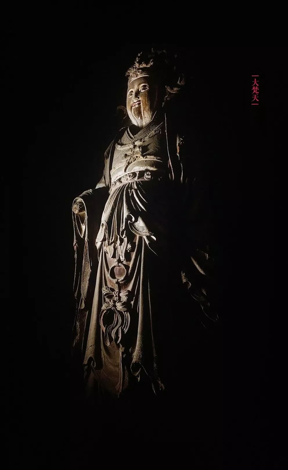 此尊造像为中国后妃装扮,头部遗失,胸饰项圈,身着广袖长衫,下身长裙及地,裙上挂满璎珞,左手执帕巾,右手残损,与大梵天相对站立。