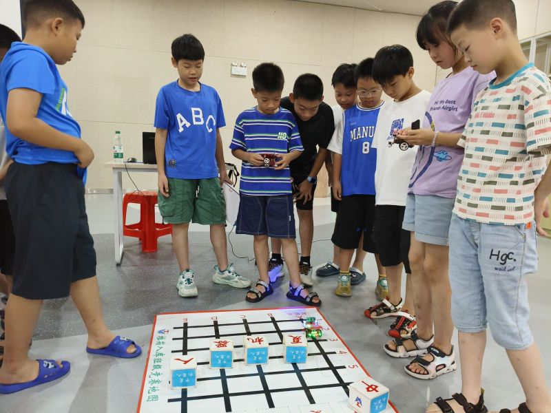 在车模推箱入库的活动现场,老师教孩子们通过计算机编程,控制一台台智能机器人闪着五颜六色的LED灯,前进,转弯,推动着模具箱进入到指定区域。