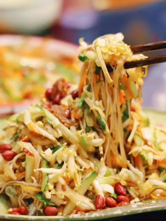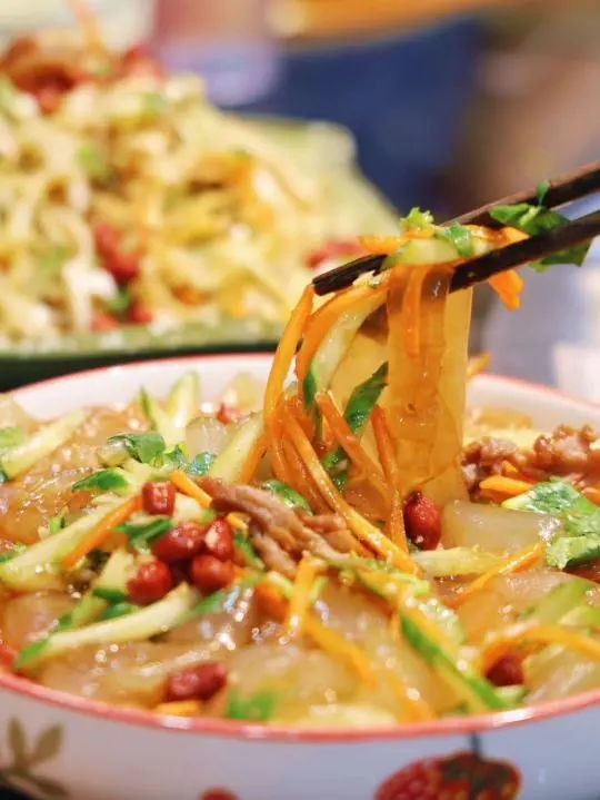 这时乘胜追击,来上一盘酸辣口的东北大拉皮和酸甜口的大拌菜,芝麻酱的香气配上醋味的酸爽,保证让你胃口大开。店里的凉气开的很足,和朋友们围坐一圈炫上一整份地锅鸡,这是什么神仙日子~