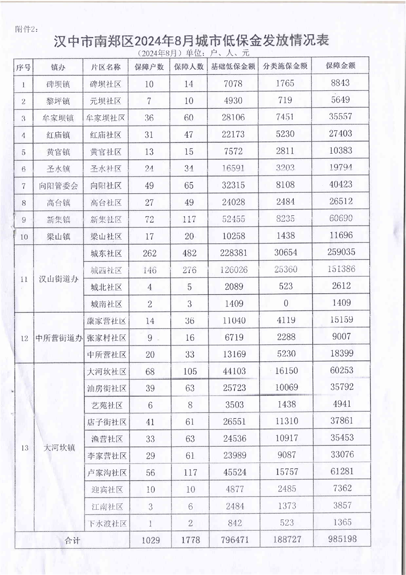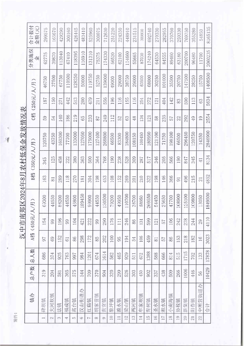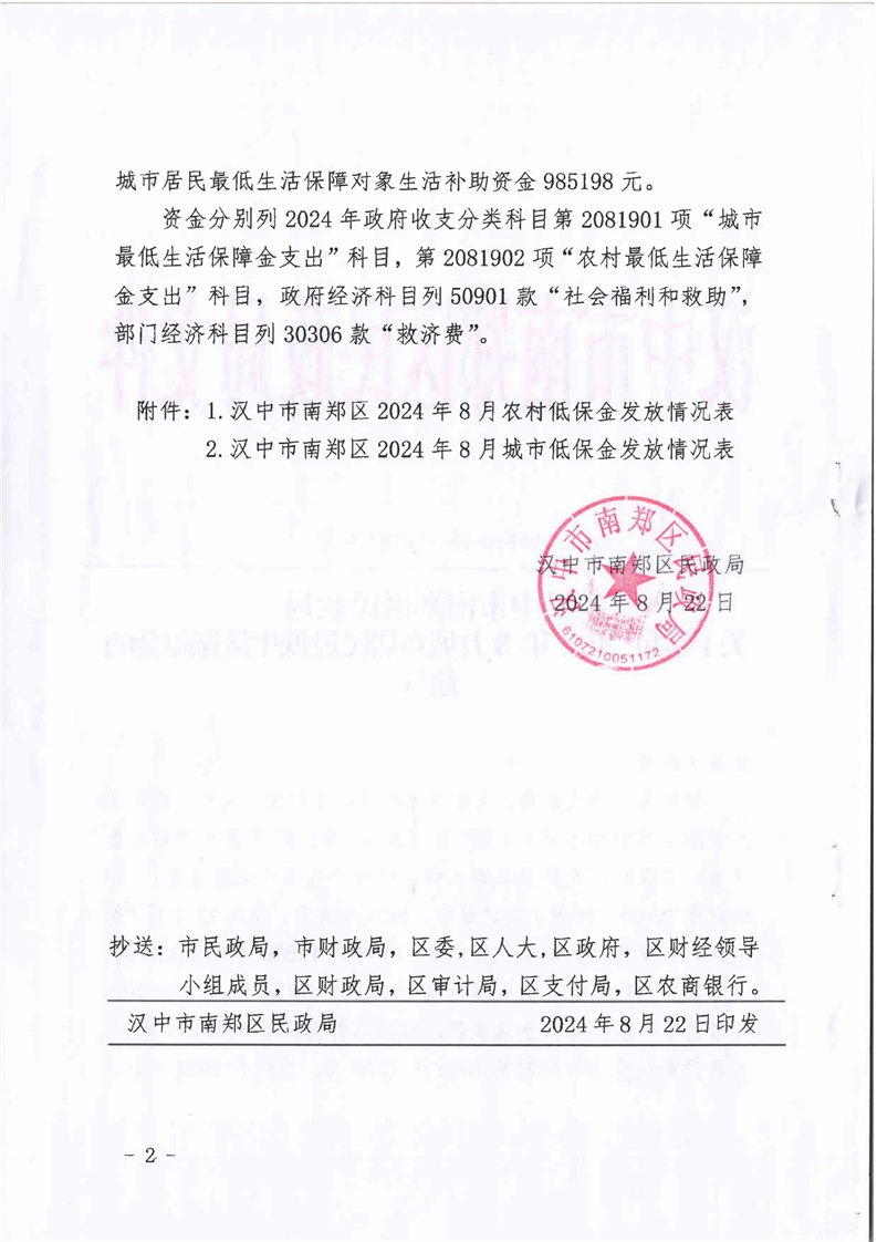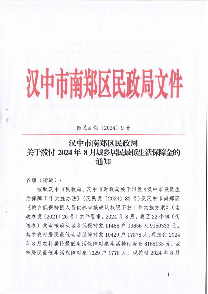 汉中市南郑区民政局关于拨付2024年8月城乡居民最低生活保障金的通知