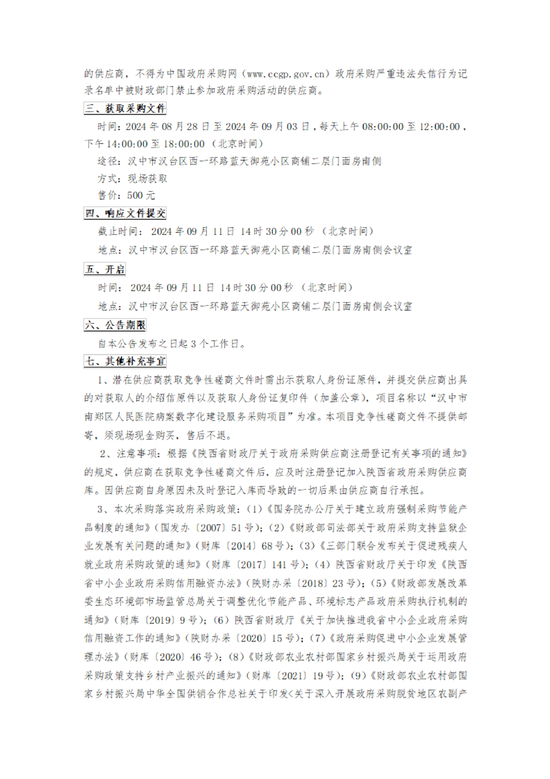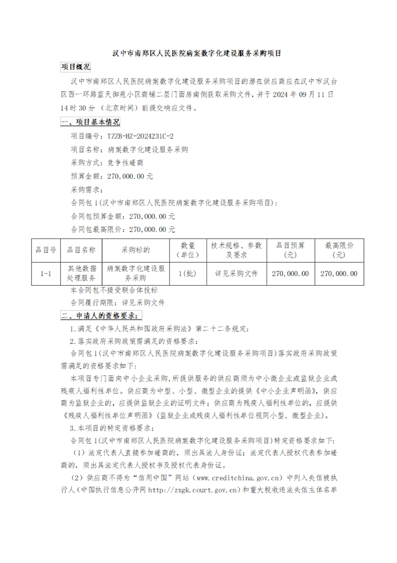 汉中市南郑区人民医院病案数字化建设服务采购项目