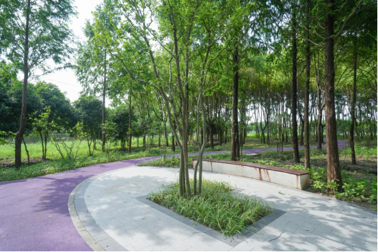 蕰北开放休闲林地位于南翔镇静华村内,蕰北路以南,蕰藻浜大桥以东,林地总面积73亩,2024年建成。以向林借景、向“阳”嬉戏为设计主题,以周边居民区为重点,运用林地自身特点,点缀休憩平台、廊架等设施,营造代表阳光、活力的休憩场所。