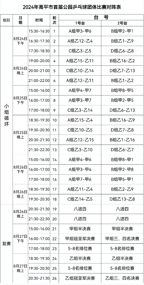 2024年高平市首届公园乒乓球团体比赛对阵表