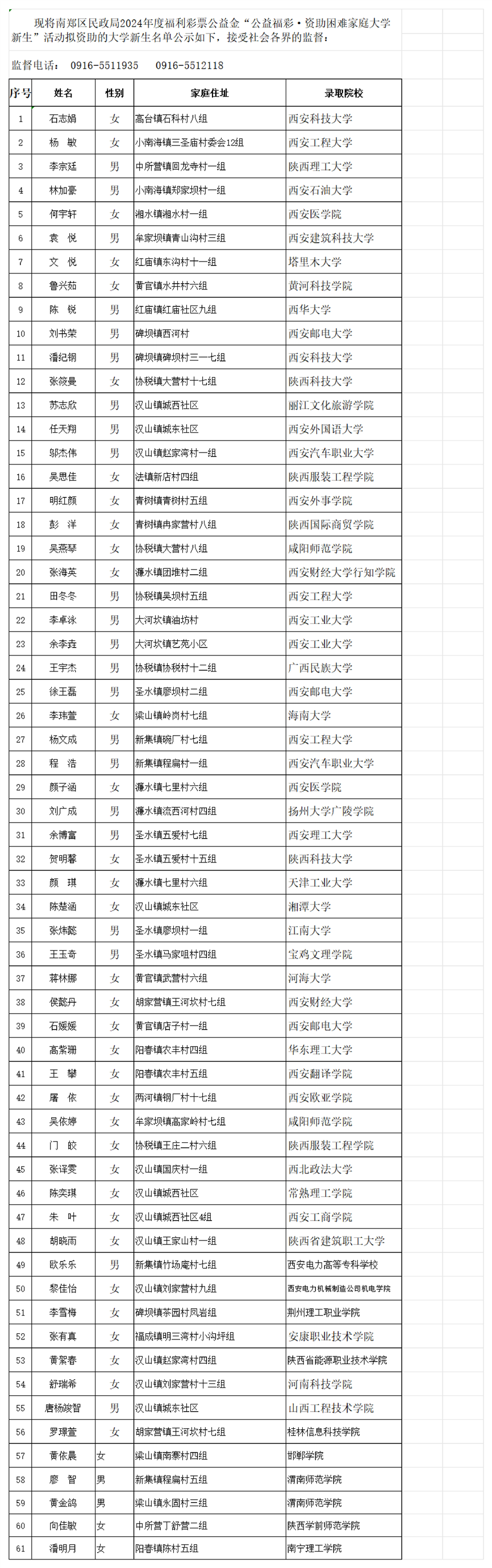 南郑区民政局2024年度福利彩票公益金“公益福彩资助困难家庭大学新生”活动拟资助的大学新生名单公示