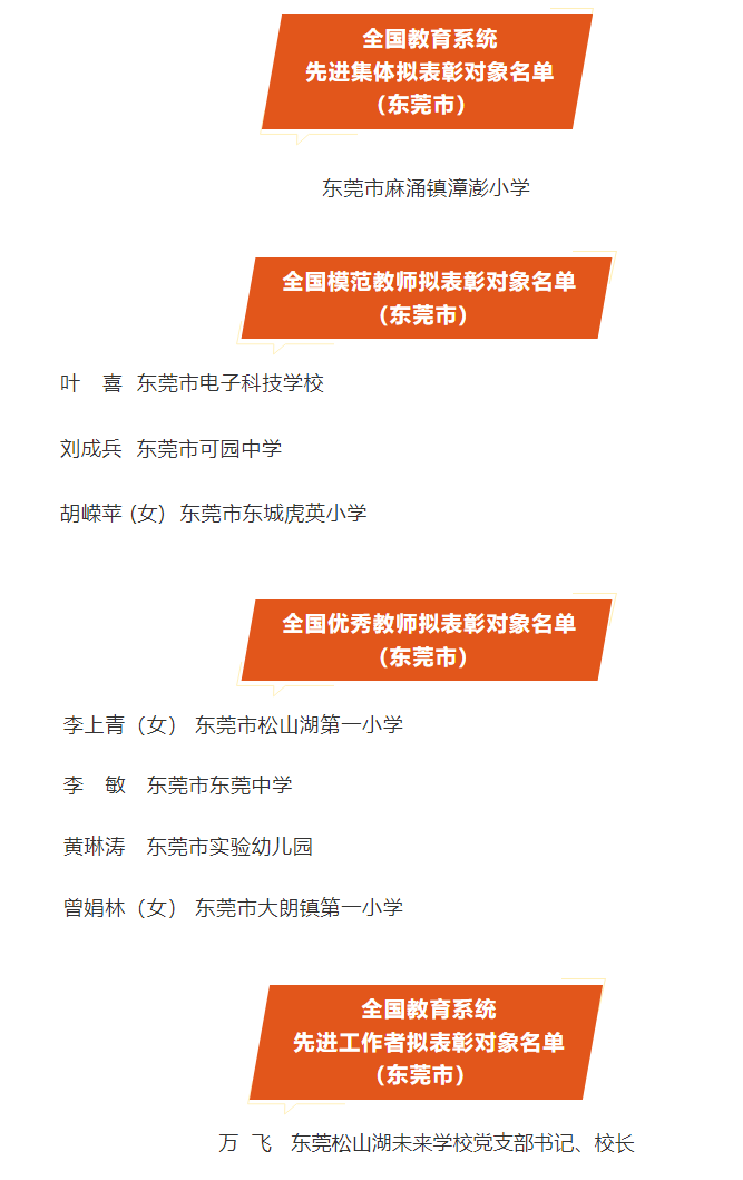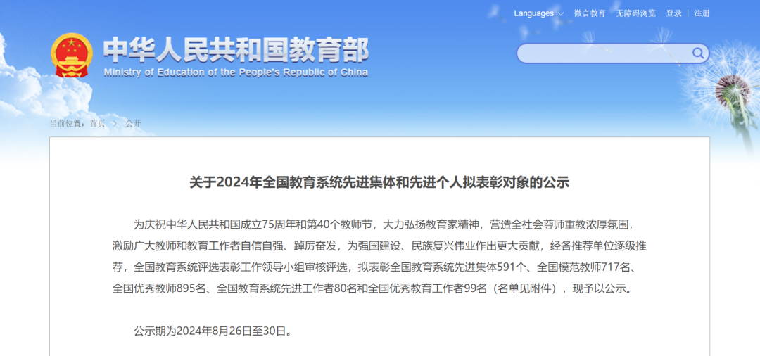 为庆祝中华人民共和国成立75周年和第40个教师节,大力弘扬教育家精神,营造全社会尊师重教浓厚氛围,激励广大教师和教育工作者自信自强、踔厉奋发,为强国建设、民族复兴伟业作出更大贡献,经各推荐单位逐级推荐,全国教育系统评选表彰工作领导小组审核评选,拟表彰全国教育系统先进集体591个、全国模范教师717名、全国优秀教师895名、全国教育系统先进工作者80名和全国优秀教育工作者99名。