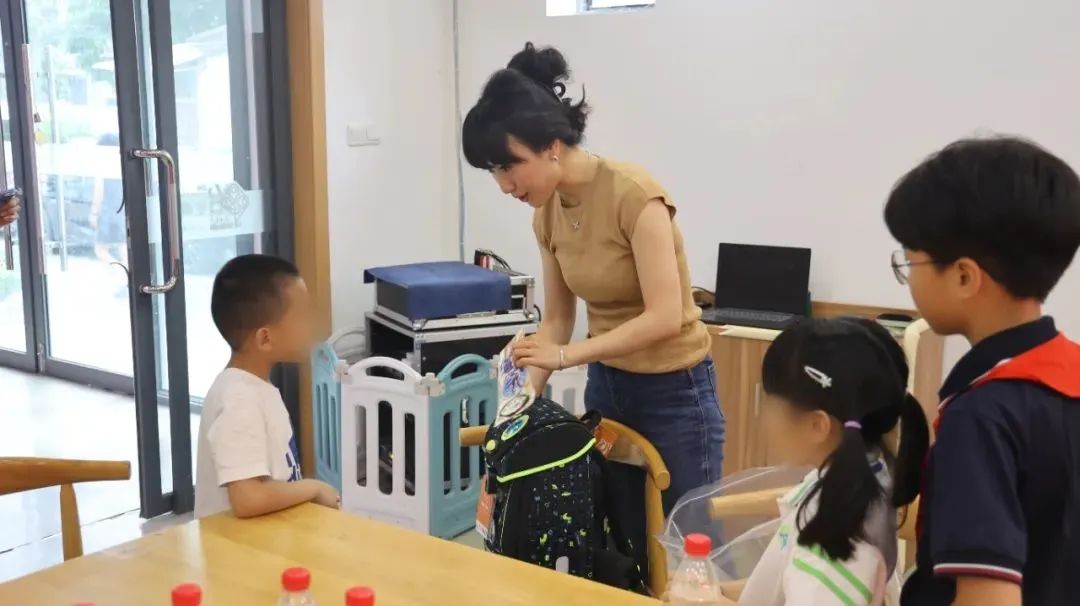 在真新街道祁连社区,瀚瀚和妈妈刘佳怡一起给7岁男孩嘉嘉(化名)送上学习用品和助学金2000元。
