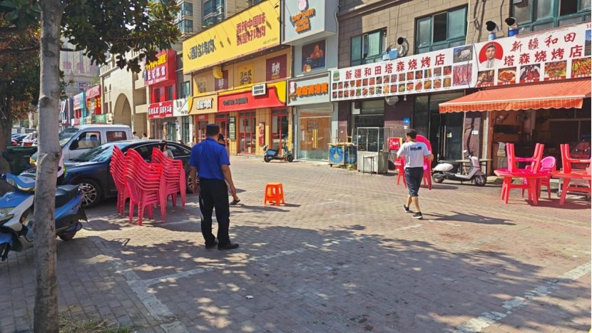 核实情况。近年来,执法人员不断加强同少数民族经营户的沟通,少数民族经营户逐渐由流动经营转变为店铺经营,且安装了油烟净化器,改变了以往占道经营脏乱差的现象,实现了市容市貌新的转变。执法人员根据线索来到双桥路,经现场核实,涉诉商铺为新疆籍少数民族群众经营,主要从事羊肉串烧烤生意,占用店外部分公共停车泊位,摆放餐桌、板凳等经营物品。
