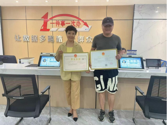 “现在开餐饮店太方便了,办证办照一天搞定”,市民倪女士在南湖新区政务信息服务中心市监专窗,高兴地向前来南湖新区调研“高效办成一件事”工作的岳阳市市场监督管理局李青松局长展示了一次性领取到的《营业执照》和《食品经营许可证》。