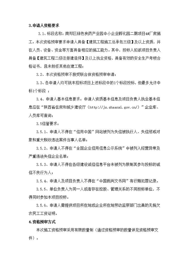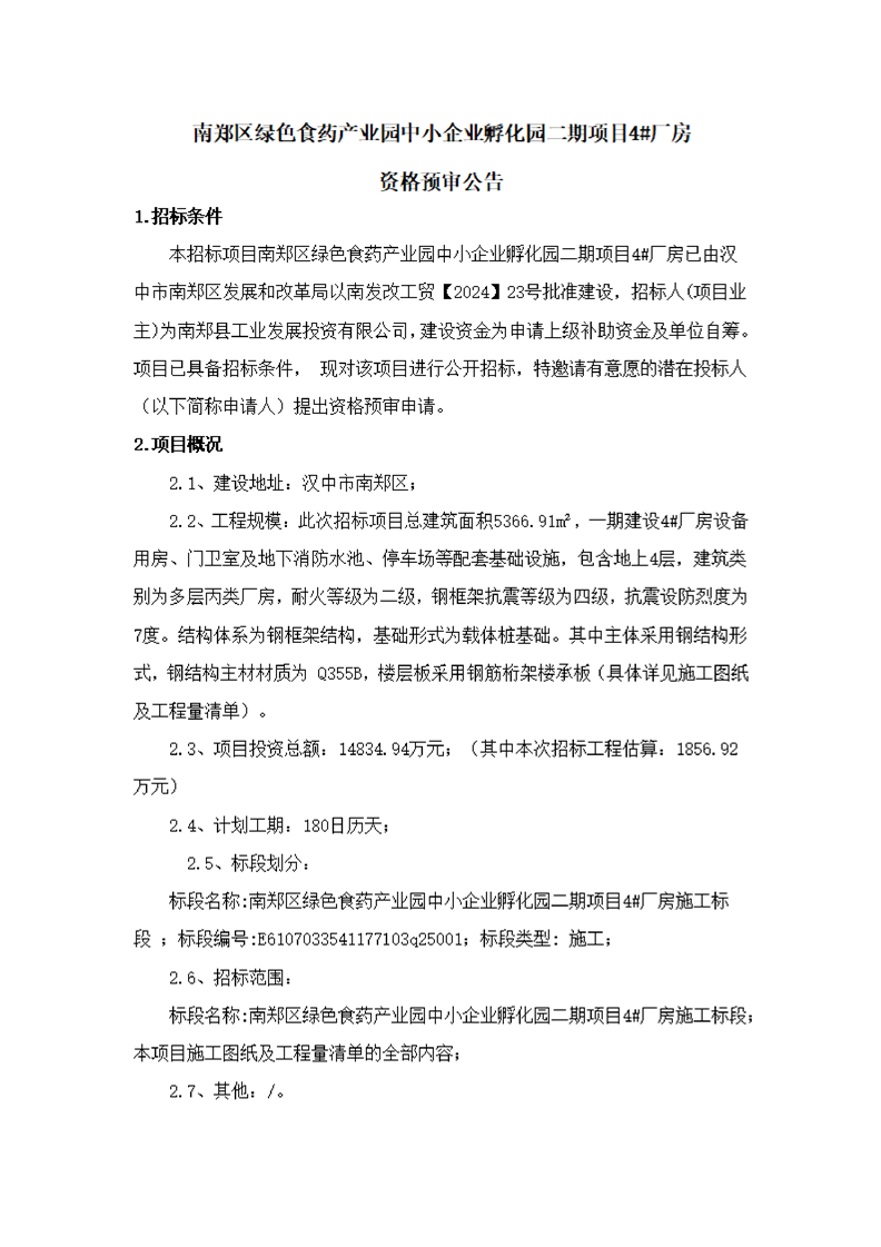 南郑区绿色食药产业园中小企业孵化园二期项目4#厂房资格预审公告