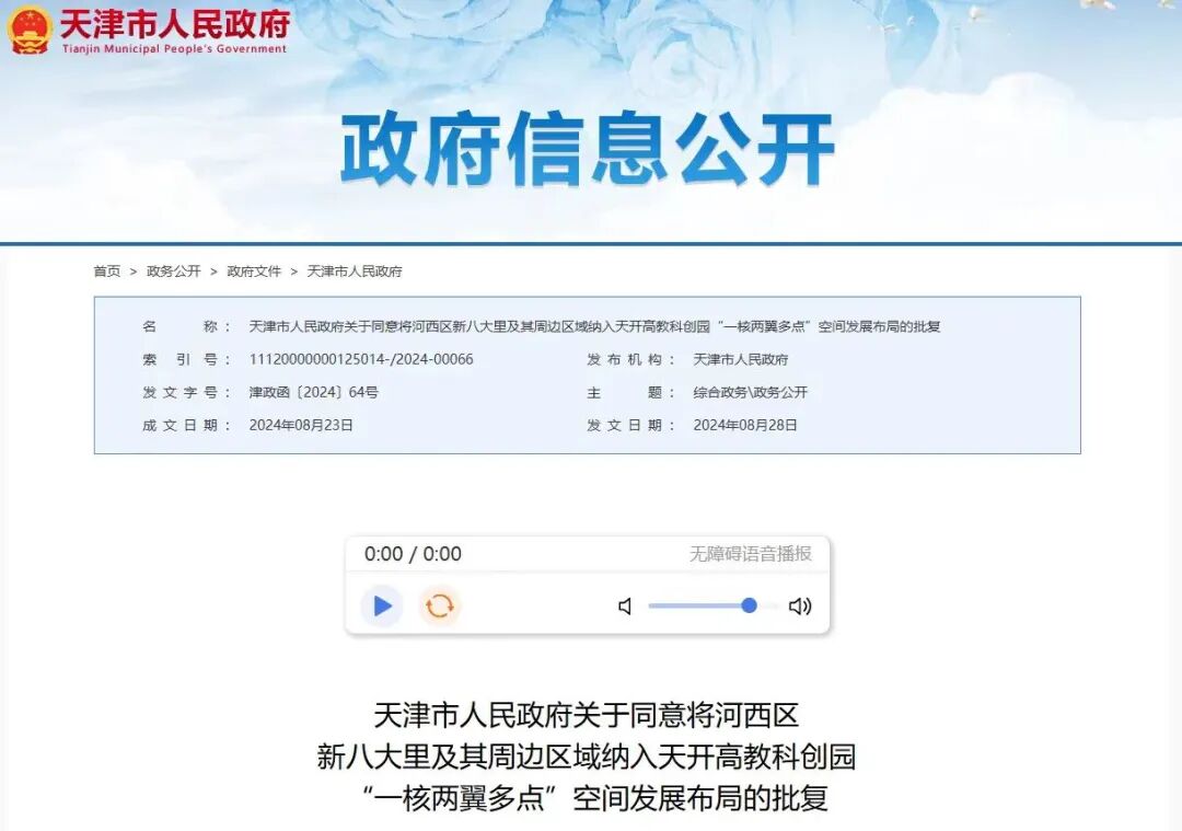 市政府近日批复同意河西区新八大里及其周边区域纳入天开高教科创园“一核两翼多点”空间发展布局。