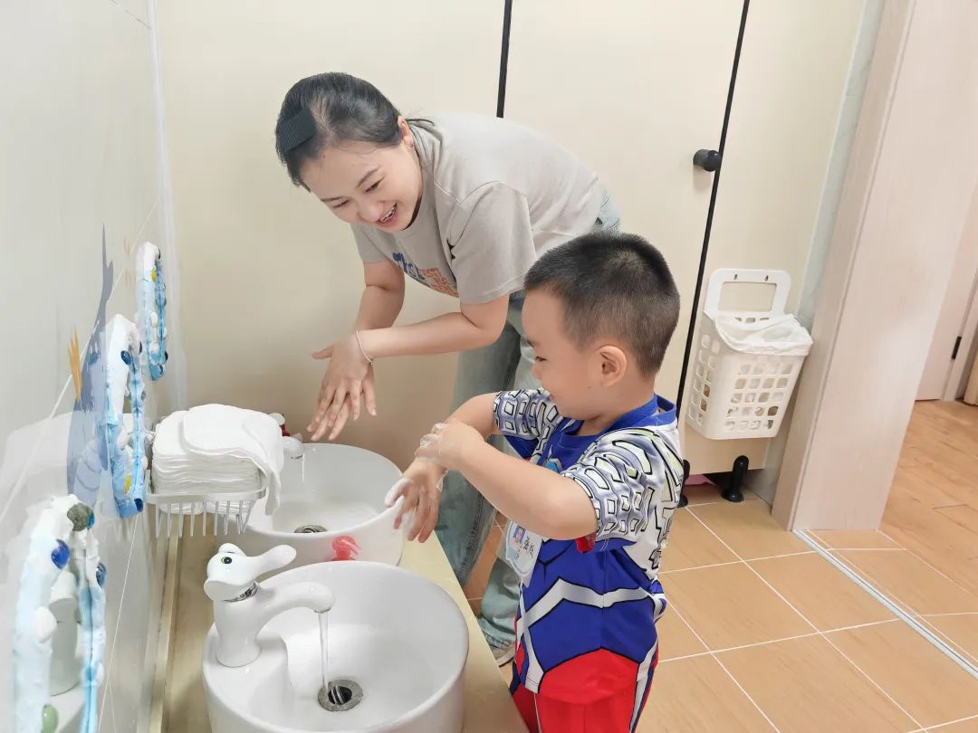 到了开心早点时间,孩子们在老师的引导下洗手、吃点心,并将用过的餐盘和擦嘴的小毛巾放在指定位置。