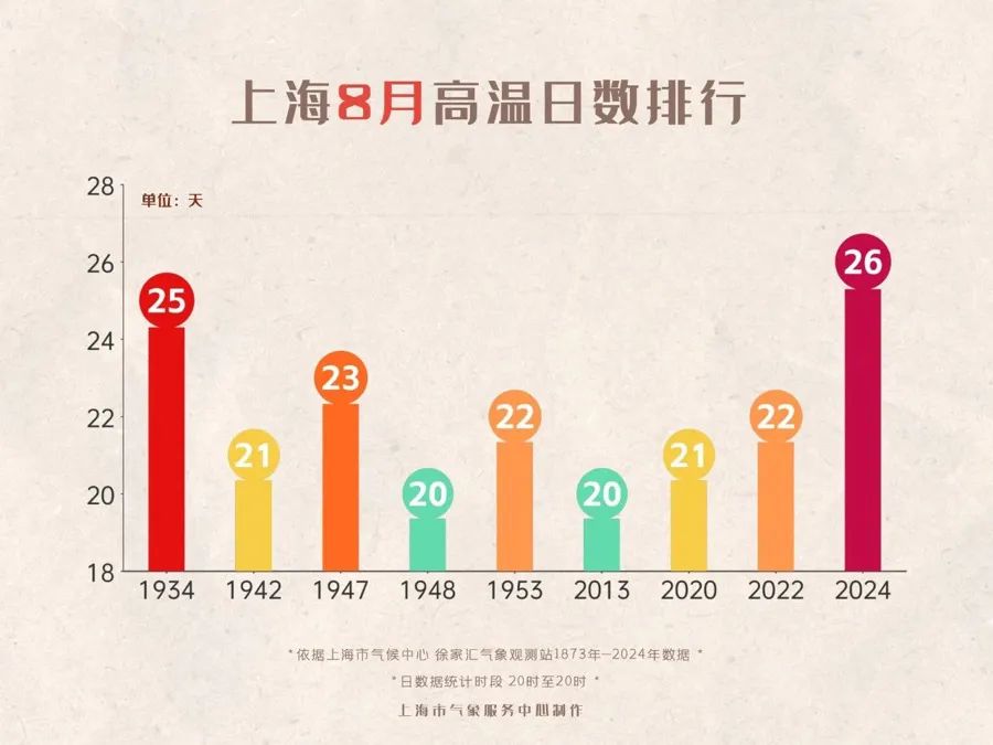 8月30日,曾被台风“珊珊”撕裂的副热带高压合二为一,再度笼罩我国大半国土,南方高温绵绵不绝,上海中心城区(徐家汇站)最高温定格35.1℃,锁定了今年第47个高温日,同时打破一项历史纪录:今年八月高温日数已达26天,成为申城历史上高温最多的八月。