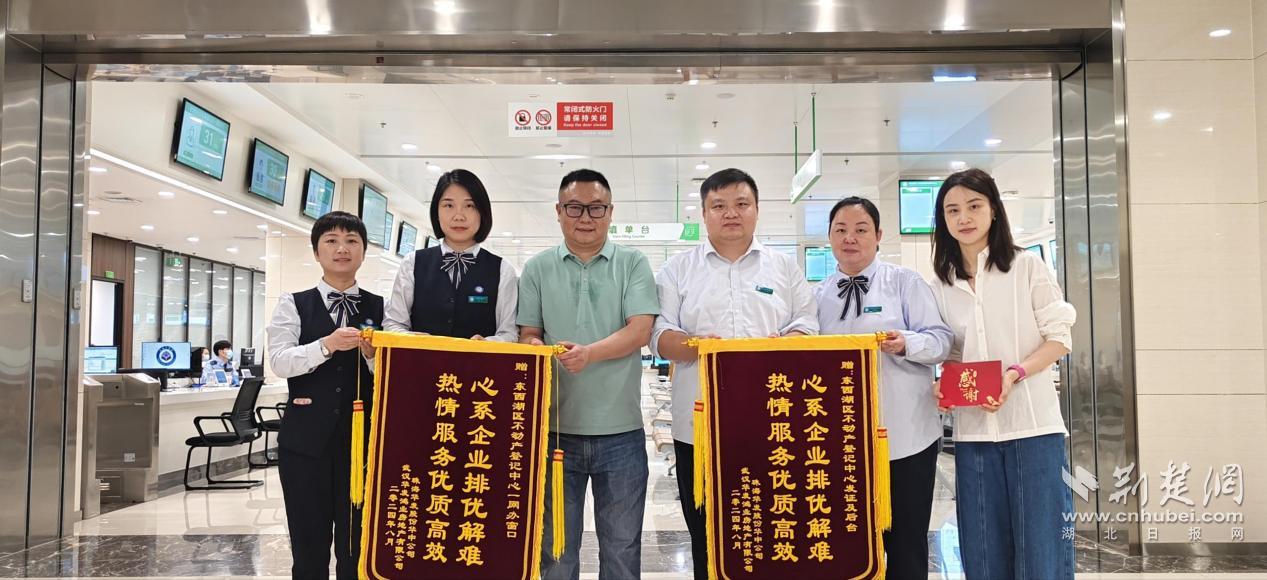 荆楚网(湖北日报网)讯(通讯员 梁莹)8月27日,武汉华发鸿业房地产开发有限公司负责人为东西湖区不动产登记中心送来两面印着“心系企业排忧解难 热情服务优质高效”的锦旗和一封表扬信,高度赞扬了工作人员优质的服务态度和高效的工作作风。