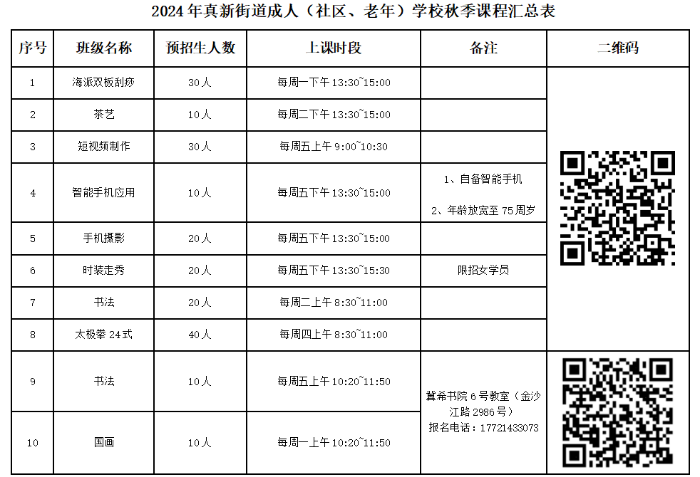 此次报名面向全体居住在真新街道的市民朋友(身体健康且年龄在70周岁以下),一人限报两个班,额满即止。(班级信息详见文末《课程汇总表》)