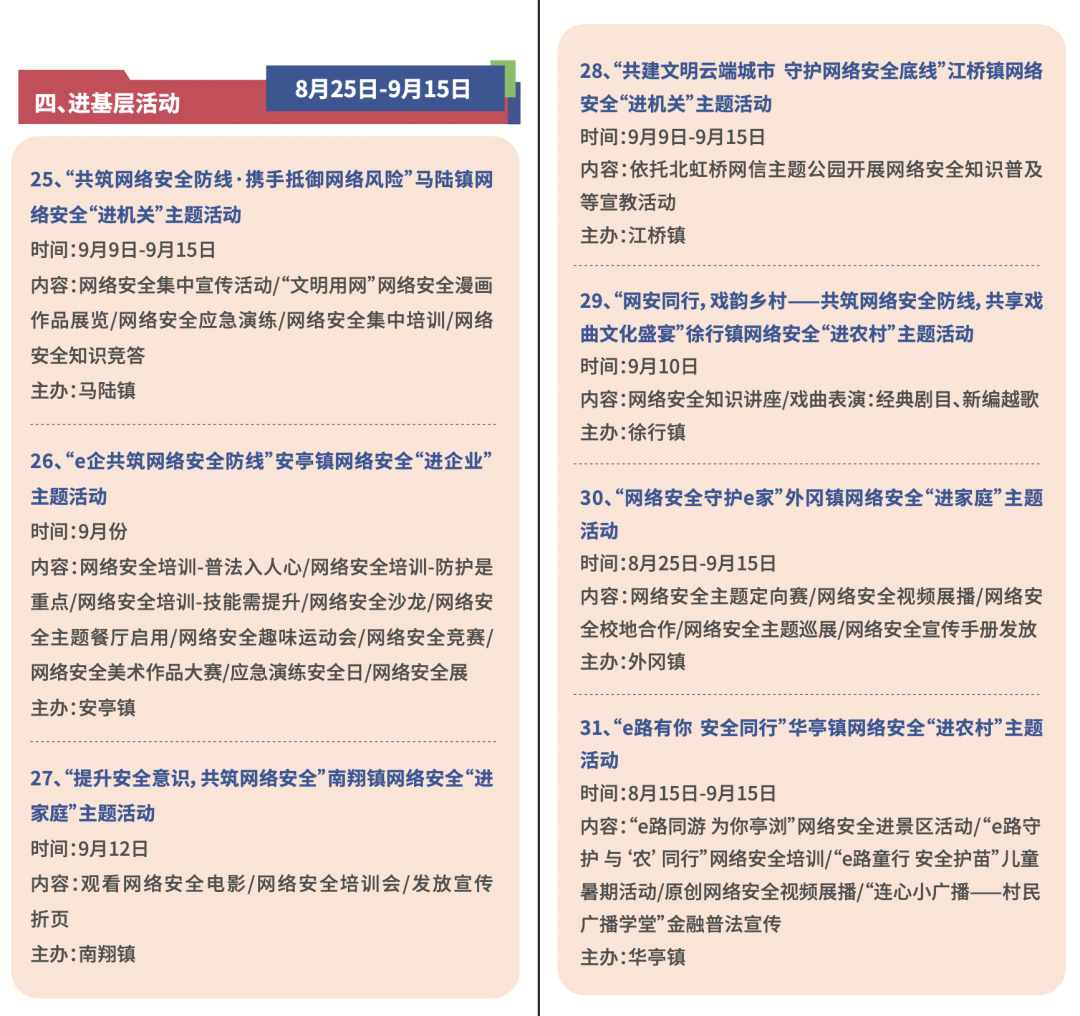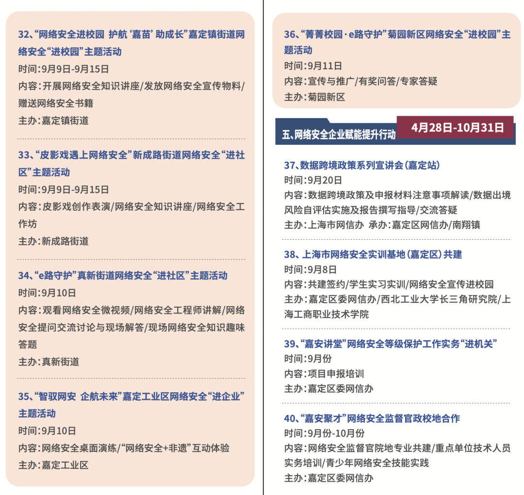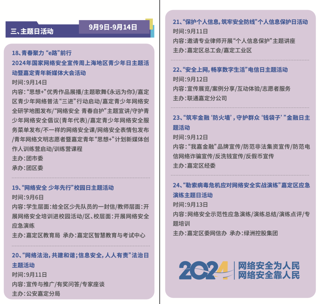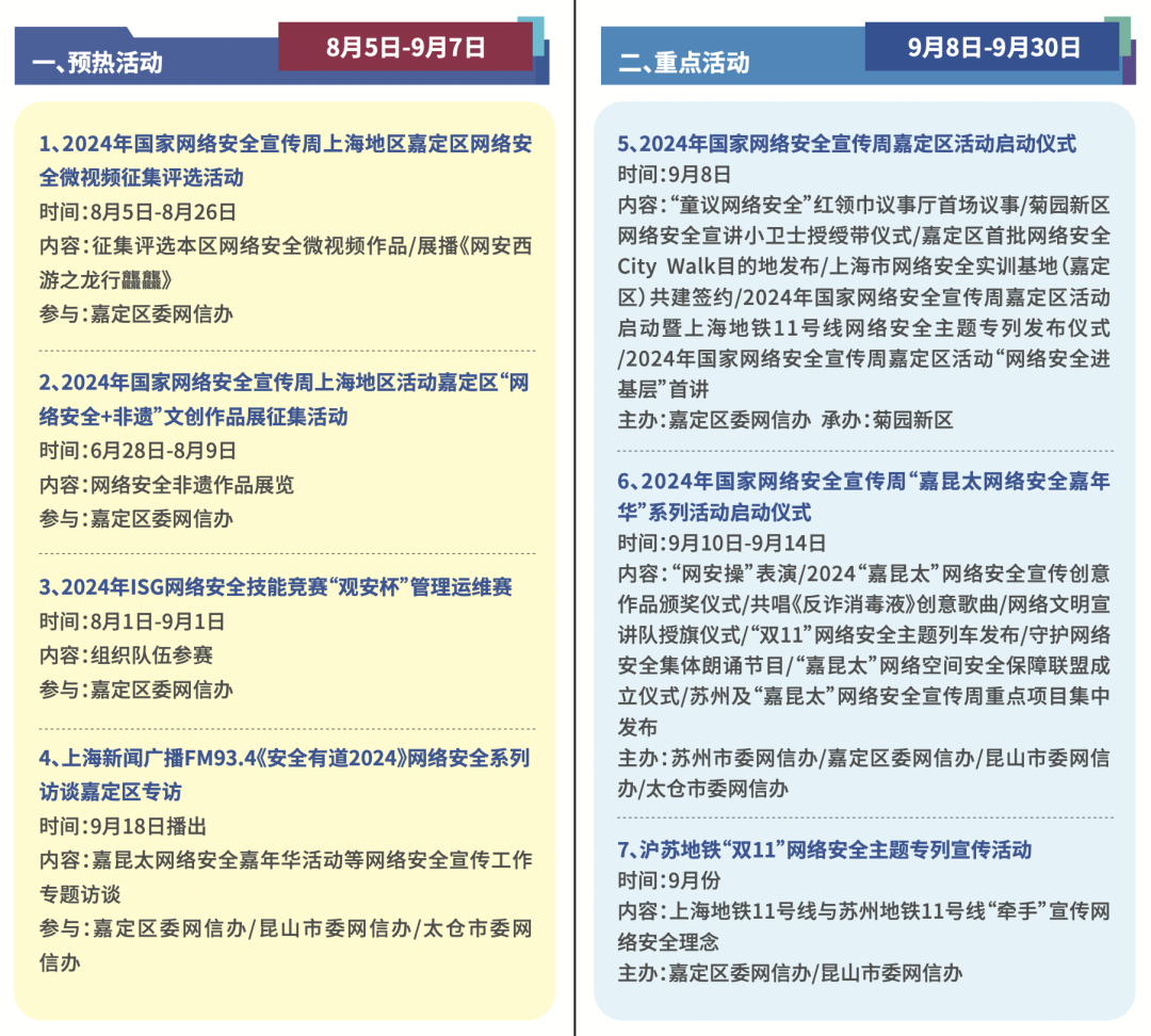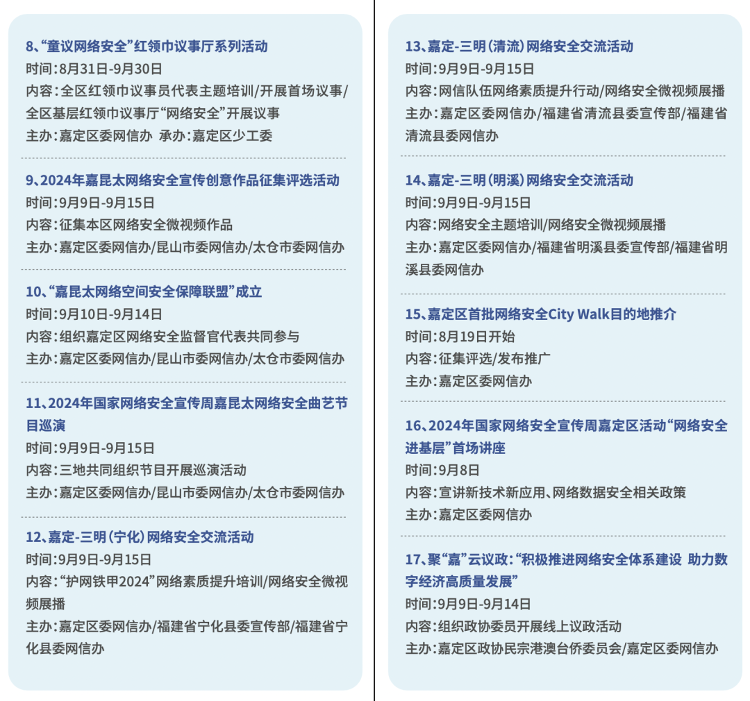 今年9月9日-15日是国家网络安全宣传周。其间,嘉定区聚焦网络和数据安全新战略、新政策、新技术、新应用,面向公众、企业集中推出预热活动、重点活动、主题日活动、进基层活动、赋能提升行动等五个系列共计40项惠民便民、创新融合的宣传和体验活动,旨在提升全社会网络安全意识和防护技能,推进安全教育、技术、产业融合发展。
