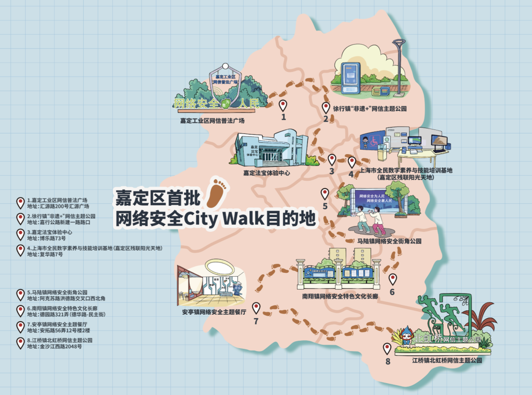 嘉定区各部门、各街镇因地制宜拓展网络安全宣传阵地、丰富教育形式、打造体验场景,致力于把知识和技术讲透彻,把理念和意识讲鲜活。启动仪式上,嘉定区首批包括主题公园、展厅、街区、餐厅在内的8个网络安全CityWalk目的地集中发布,兼具文化性、互动性、趣味性的网络安全新地标,将让市民在城市漫步、休闲娱乐中,想得到、看得懂、记得住“网络安全那些事”。