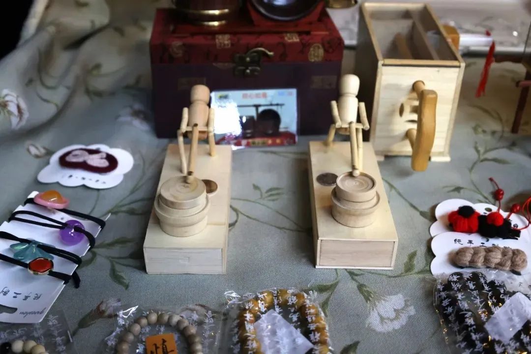 在另外一边的丰怡社区手工作品摊位前也聚集了许多居民。木头人、檀木手串、竹篮……种类多多。“我从小就喜欢做一些小工艺品,退休后我又专门学习了制作木材工艺品。”丰怡社区居民范建生说:“这些都是我自己做的,有些还是用废旧的家具的木料做的,参加义卖让这些东西变得更有价值。”