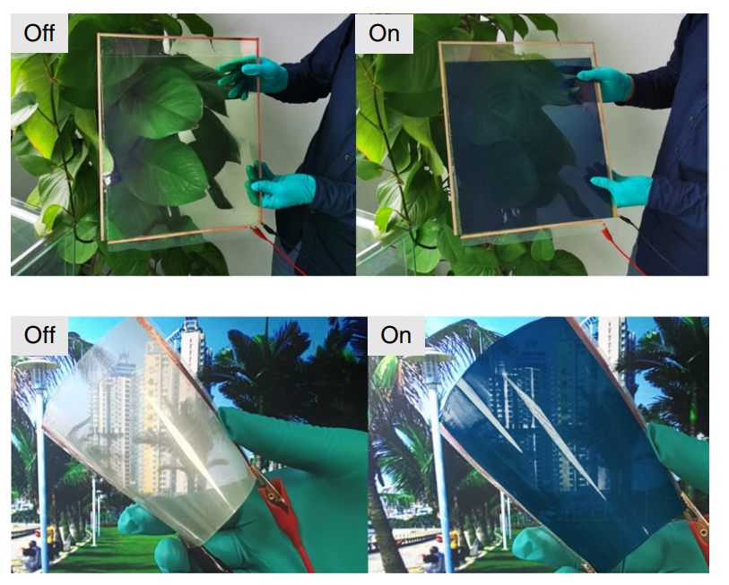 “电致变色隔热调光智能器件是一种面向生产生活方式绿色转型的革新方案。该器件通过电信号控制玻璃颜色深浅,实现主动调节光线透射和隔热效果,提高了汽车驾驶的舒适性,降低能耗,保护乘客隐私。”光热调控智能材料项目团队成员季晓炜介绍。